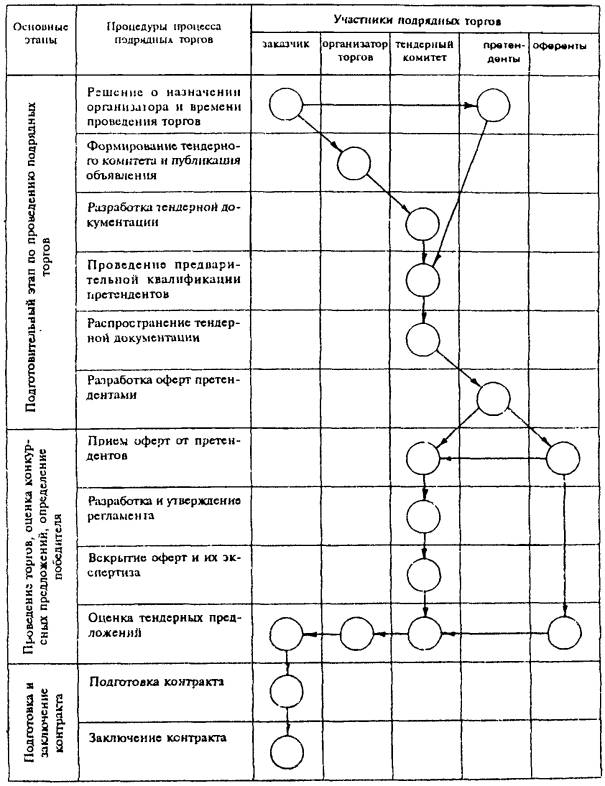 На рисунке процесс разбит на ряд последовательных этапов, состоящих из набора процедур. Реализация процедур каждого этапа характеризуется качественными изменениями в процессе. Например, завершение подготовительного этапа позволяет организовывать и проводить торги, окончание этапа проведения подрядных торгов, оценки конкурсных предложений и выявление победителя означают, по существу, что торги завершились и начинается новый этап - этап подготовки и заключения контракта между победителем торгов и заказчиком. 2.3. Общая схема процесса подрядных торгов позволяет проследить процесс взаимодействия участников торгов по выполнению тех или иных работ, определенных в соответствующих процедурах. Анализ организационной схемы выявляет также функциональные задачи, выполняемые каждым участником в процессе проведения торгов, их последовательность и сроки выполнения. Приведенная на рисунке схема носит общий характер, на ней отсутствует временная ось. Однако при разработке аналогичной схемы для реального объекта и конкретного предмета торгов временная ось может быть проведена (на рисунке она показана пунктирной линией), и тогда данную схему можно рассматривать как модель процесса, протекающего в реальном масштабе времени. 2.4. Общий методический подход при определении перечня процедур процесса и их содержания связан с подготовкой и реализацией решения. Это позволяет определить управленческие решения всех участников торгов на разных этапах их проведения. 3. УЧАСТНИКИ ТОРГОВ3.1. Заказчик - лицо, для которого строится, реконструируется или переоснащается объект. На момент принятия решения о проведении подрядных торгов заказчик должен обладать необходимыми инвестиционными ресурсами (или правом распоряжаться ими в необходимый период времени), подтвержденными соответствующими финансовыми документами, например кредитным договором, банковской справкой, постановлением исполнительного органа государственной власти. Заказчик обязан иметь статус официального юридического или физического лица с соответствующей регистрацией и с правом осуществления функций заказчика. При проведении торгов заказчик осуществляет следующие функции: назначает организатора торгов; контролирует работу и участвует в работе тендерного комитета через своего представителя; устанавливает окончательные условия контракта и заключает его с победителем. 3.2. Организатор торгов - лицо, которому заказчиком поручено проведение торгов. Организатор торгов обязан иметь статус юридического лица и лицензию на право проведения торгов. В качестве организатора торгов могут выступать специализированные на проведение подрядных торгов организации и учреждения независимо от форм собственности. Организатор торгов осуществляет следующие функции: подготавливает документы для объявления торгов, публикует объявление или рассылает приглашения; формирует тендерный комитет; направляет и контролирует деятельность тендерного комитета и привлекаемых инженерно-консультационных организаций по подготовке тендерной и другой необходимой документации; собирает и анализирует оферты; утверждает результаты торгов; рассматривает апелляции на решение тендерного комитета; несет все расходы по подготовке и проведению торгов. 3.3. Тендерный комитет - постоянный или временны