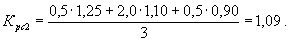 Примечания: 1. При наличии на обочине крупных промоин, продольной колеи вдоль кромки проезжей части или краевой укрепленной полосы, а также при расположении поверхности обочины выше или ниже поверхности покрытия на проезжей части или краевой полосе более чем на 40 мм значения Крс2 принимают как для неукрепленной обочины, независимо от типа укрепления. 2. Значения Крс2 для обочин, укрепленных засевом трав, принимают, когда на всей ширине укрепленной полосы имеется сплошной травяной покров не более 5 см. При наличии на полосе, укрепленной засевом трав, разрушений травяного покрова значения Крс2 принимают как для неукрепленной обочины. Пример 1. Общая ширина обочины Воб = 3 м. Из них ширина краевой полосы из асфальтобетона 0,5 м; ширина укрепленной щебнем полосы - 2 м и ширина неукрепленной полосы - 0,5 м. По табл. 5.8 для общей ширины обочины 3 м принимаем значение Крс2 при укреплении: асфальтобетоном 1,25; щебнем - 1,10; для неукрепленной обочины - 0,90. Средневзвешенная величина Крс2 будет: