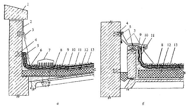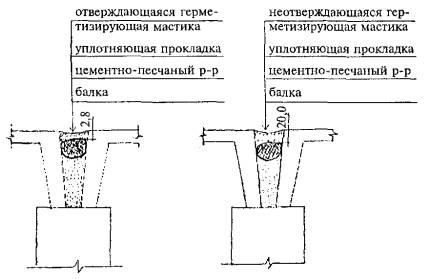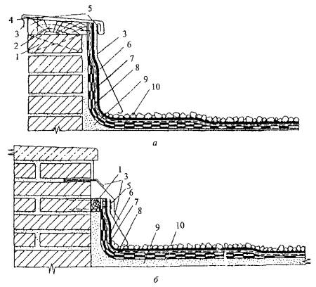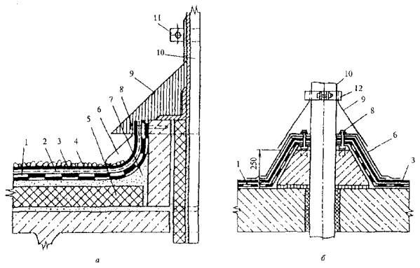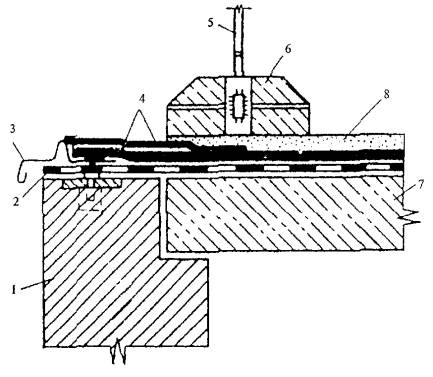 По окончании работ по подготовке основания составляется акт приемки основания. 2.6. Для снятия старого рулонного ковра используют машину конструкции ЛНИИ АКХ (Ленинградский научно-исследовательский институт академии коммунального хозяйства), предназначенную для нарезки швов в рулонном ковре. Машина используется на крышах зданий с уклоном до 15 %. Применение машины ЛНИИ АКХ позволяет разрезать рулонный ковер с помощью вращающейся фрезы на требуемую глубину. Перемещение машины осуществляется вручную. Зона обслуживания машиной ЛНИИ АКХ и размеры захваток определяются длиной электрических кабелей и конструктивными размерами зданий. Как правило, интервал между нарезаемыми швами принимается равным 1,0 м. По мере окончания работ на захватке машина ЛНИИ АКХ передвигается на очередную захватку. Машина ЛНИИ АКХ работает следующим образом: - устанавливают требуемую глубину врезания фрезы, определяемую толщиной рулонного покрытия, и включают электродвигатель; - фрезу плавно опускают до касания с поверхностью рулонного ковра, и начинают равномерно двигать вперед, обеспечивая требуемую глубину нарезки шва. При перемещении машины на новое место, предварительно необходимо вывести фрезу из материала кровли. 2.7. После нарезания швов рулонного ковра кромки торцов образовавшихся полос надрезают вручную с помощью инвентарного скребка, скатывают в рулоны и удаляют с крыши. Затем основание кровли очищают скребком от остатков мастики. 2.8. Восстановление разрушенных участков основания производится следующим образом: заделываются швы между плитами (рис. 1). Если поверхность основания не отвечает заданным требованиям, ее выравнивают цементно-песчаным раствором. Рис. 1. Конструктивные решения герметизации швов кровельных плит При необходимости производится оклейка с пропиткой полимерно-битумной композицией «Антикор МПБ» мест сопряжения основания кровли с металлоконструкциями, трубами, водоприемными воронками, армирующими материалами (например, стеклотканью) (рис. 2, 3, 4, 5). 2.9. После снятия старого ковра, основание кровли должно быть высушено. Для этой цели используют специальную машину марки СО-107 для сушки основания кровли. Использование этой машины обеспечивает высокое качество подготовки поверхности основания под устройство кровли. Зона обслуживания машины СО-107 и размеры захваток определяются конструктивными размерами зданий. 2.10. Очистка основания кровли от мусора и пыли производится с помощью сжатого воздуха. Для этой цели следует применять компрессор СО-62 (СО-7А). 2.11. Работы по производству ремонта кровель с применением битумно-полимерной мастики («Антикор МПБ») выполняются в соответствии со схемой организации работ на захватке (рис. 6). Для приготовления, подачи и нанесения мастики используется станция СО-145. 2.12. Ремонт различных кровель. При выполнении ремонтных кровельных работ необходимо установить количество слоев в старом кровельном ковре, и если оно превышает шесть, то необходимо этот ковер удалить и отремонтировать стяжку или выполнить ее заново. При меньшем количестве слоев старое кровельное покрытие может быть отремонтировано. Возможность и целесообразность снятия старого кровельного покрытия или его ремонта определяет проектная организация, давая официальное заключение. Снятие старого кровельного покрытия ос