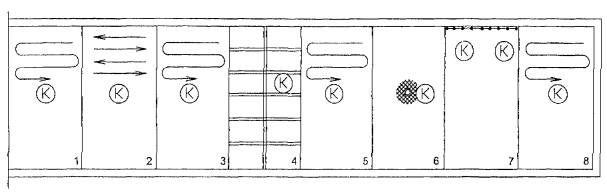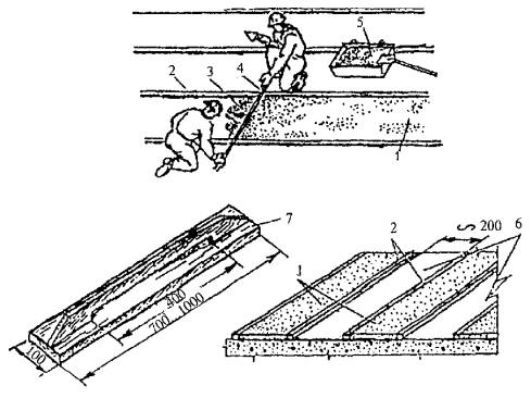 Рис. 7. Схема устройства стяжки 1 - цементно-песчаный раствор; 2 - рейка-ограничитель ширины полосы укладки раствора; 3 - укладываемый (выравниваемый) раствор; 4 - разравнивающая рейка-правило; 5 - емкость с раствором; 6 - зоны последующей укладки; 7 - полутерок для разравнивания и заглаживания раствора 2.14. Ремонт кровли из рубероида состоит в основном в нанесении на подготовленную поверхность старой кровли слоя композиции толщиной не менее 2 мм. Подготовка поверхности рубероидной кровли состоит главным образом в устранении и ремонте мест вздутий путем их разрезки и приклейки слоев. Затем с поверхности кровли удаляются разрушенные частицы материала, мастики, отложения пыли, листья. При необходимости выравнивания скатов пониженные места заполняются мастикой, шпаклевкой или строительными растворами.(кроме известковых). Восстанавливаются все места примыканий с удалением разрушенных краев рубероидной кровли. С мест примыкания начинается нанесение ремонтного слоя композиции на всей поверхности кровли. 2.15. Ремонт скатной кровли из жестких асбестоцементных (волнистых и плоских) и металлических (плоских и профилированных) листов возможен при сохранении ими несущей способности и появлении протечек в соединениях и отдельных местах. При этом может проводиться ремонт частичный или полный. При частичном ремонте композицией «Антикор МПБ» покрываются участки (полосы) расстроенных стыков и соединений, при этом возможно армирование стеклотканью. При полном ремонте слой композиции толщиной 1,5 мм покрывает всю поверхность кровли. 2.16. При выполнении ремонтных кровельных работ следует учитывать возможность выпадения обильных осадков в виде дождей и ливней. В данном случае проведение изоляционных работ должно быть организовано небольшими захватками, в пределах сменной производительности бригады, не допуская одновременно полного снятия всего старого кровельного ковра. 2.17. При вскрытии старого кровельного покрытия приходится очищать стяжку или выполнять ее заново. Цементно-песчаный раствор для устройства стяжки подается растворонасосом. Стяжки укладываются полосами шириной 2 м и длиной 6 м с заполнением их раствором через одну (рис. 7). После схватывания раствора заполняют пропущенные полосы, при этом края готовых полос служат маяками, а начальные маяки-рейки обязательно извлекаются. При уклоне кровли до 15 % полосы располагаются поперек ската, а при уклоне более 15 % - по скату. Раствор укладывают вначале на наиболее удаленные участки, постепенно отступая к месту подачи раствора на крышу. При уклонах до 15 % стяжку сначала делают в узлах - сопряжениях и примыканиях, а затем на плоскостях скатов. Для разравнивания раствора используются правила, виброрейки или пневмогладилки. Полосы заполняют раствором так, чтобы после извлечения маячных реек образовались температурно-усадочные швы площади покрытия размером не более 6´6 м. Заделка температурно-усадочных швов приведена на рис. 1. 2.18. После окончания всех кровельных работ необходимо выполнить требования экологической чистоты: все остатки битума, мастичных материалов, обрезки рулонных материалов тщательно упаковать в емкости, контейнеры, опустить на землю и затем вывезти в специально отведенные места. Таблица 2 Материально-технические ресурсы