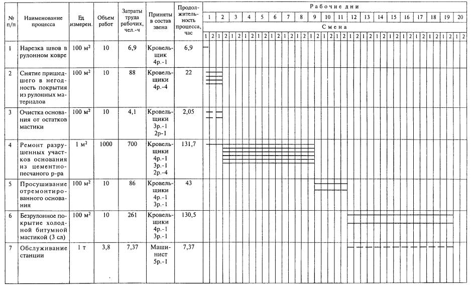 5. ТЕХНИКА БЕЗОПАСНОСТИ И ОХРАНА ТРУДА, ЭКОЛОГИЧЕСКАЯ И ПОЖАРНАЯ БЕЗОПАСНОСТЬ5.1. При выполнении работ по ремонту кровель необходимо соблюдать требования, изложенные в СНиП III-4-80 «Техника безопасности в строительстве», ГОСТ 12.0.004-79 «Организация обучения работающих безопасности труда. Общие положения», ГОСТ 12.3.040-86 «Строительство. Работы кровельные и гидроизоляционные. Требования безопасности» и положения инструкции по эксплуатации машины ЛНИИ АКХ и СО-106 (107). 5.2. Допуск рабочих к выполнению кровельных работ разрешается после осмотра прорабом или мастером совместно с бригадиром исправности несущих конструкций крыши и ограждений. 5.3. При выполнении работ на крыше с уклоном более 20° рабочие должны применять предохранительные пояса. Места закрепления предохранительных поясов должны быть указаны мастером или прорабом. 5.4. Для прохода рабочих, выполняющих работы на крыше с уклоном более 20°, а также на крыше с покрытием, не рассчитанным на нагрузки от веса работающих, необходимо устраивать трапы шириной не менее 0,3 м с поперечными планками для упора ног. Трапы на время работы должны быть закреплены. 5.5. Размещать на крыше материалы допускается только в местах, предусмотренных проектом производства работ, с применением мер против их падения, в том числе от воздействия ветра. Не допускается хранение и складирование на крыше материалов в большем количестве, чем требуется для работы на данном участке. 5.6. Не допускается выполнение кровельных работ во время гололеда, тумана, исключающего видимость в пределах фронта работ, грозы и ветра скоростью 15 м/с и более. 5.7. Заготовка элементов и деталей кровли непосредственно на крыше не допускается. 5.8. К работе по устройству кровель допускаются лица не моложе 18 лет, имеющие профессиональные навыки, прошедшие обучение безопасным методам труда и приемам этих работ и получившие соответствующие удостоверения. 5.9. Рабочие, занятые на устройстве кровель, должны быть обеспечены спецодеждой, спецобувью и другими средствами индивидуальной защиты в количестве не ниже установленных норм. На местах проведения работ должны быть питьевая вода и аптечка для оказания первой медицинской помощи. 5.10. В случае отсутствия наружных строительных лесов здание, на котором производятся ремонтные кровельные работы, ограждается во избежание доступа людей в зону возможного падения материалов, инструмента, тары и др. Таблица 5 График производства работ