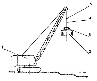 3.1.5. В целях исключения переувлажнения грунтов на дне отрытых траншей и котлованов в процессе их уплотнения, а также при прокладке сетей и устройстве фундаментов, складировании грунтов и др. материалов и изделий общую планировку площадки необходимо выполнять с обеспечением быстрого стока поверхностных (дождевых, талых и т.п.) вод в пониженные места рельефа, исключить сток вод в траншеи и котлованы. 3.1.6. Въезды в траншеи и котлованы в целях исключения стока в них поверхностных вод следует устраивать с низовой стороны с уклоном 0,1 - 0,15 и располагать их с боковых сторон. 3.1.7. В том случае, если фактический коэффициент уплотнения насыпных грунтов в основании наружных сетей окажется равным Kcom ³ 0,95, то уплотнение насыпных грунтов тяжелыми трамбовками на этих участках допускается не выполнять; среднее значение Kcom ³ 0,93 при минимальном значении Kcom ³ 0,92 рекомендуется производить частичное доуплотнение насыпных грунтов 2 - 4 ударами трамбовки по одному следу; Kcom £ 0,93, а также при Kcom ³ 0,93 и минимальных значениях Kcom £ 0,92 уплотнение насыпных грунтов тяжелыми трамбовками необходимо выполнять до «отказа». 3.1.8. При повышенной влажности, превышающей оптимальную (или влажность на границе раскатывания) более чем в 1,3 раза, переувлажненные насыпные грунты на отдельных участках в основаниях зданий необходимо выбирать на глубину до 1 - 1,5 м и заменять их пылевато-глинистыми грунтами с влажностью, близкой к оптимальной. В основаниях трубопроводов наружных сетей на участках с переувлажненными насыпными грунтами допускается коэффициент уплотнения принимать Kcom > 0,92 при минимальном его значении в отдельных точках Kcom > 0,91. 3.2. Оборудование для уплотнения грунтов3.2.1. Для уплотнения грунтов тяжелыми трамбовками рекомендуется использовать тросовые краны-экскаваторы типа: ЭО-5111, Э-10011, Э-1252 и их модификации, оборудованные стрелой драглайн с навешанными на них трамбовками массой 3 - 4,5 тс и диаметром основания 1,4 - 1,8 м. Трамбовки изготовляются из железобетона в металлической форме в виде опорного листа и круглой оболочки по чертежам, разработанным АОЗТ ЦНИИОМТП. 3.2.2. В целях исключения повышенного износа механизмов масса трамбовок должна быть в 4 - 5 раз меньше грузоподъемной силы крана экскаватора. Трамбовка подвешивается к рабочему тросу крана через гибкую вставку длиной 0,6 - 1 м в виде цепи или петли из троса с грузом массой 25 - 40 кгс (Рис. 1). Это исключает закручивание и петлеобразование рабочего троса. Для сохранения бетона трамбовки от разрушения падающим грузом на верх трамбовки укладывают изношенный баллон от легкового автомобиля. 3.2.3. Длительная нормальная работа крана-экскаватора при трамбовании грунтов обеспечивается выполнением в пп. 3.1.1 и 3.1.2 рекомендаций, а также ровной планировкой дна траншей и котлованов, соблюдением технологии производства работ по п. 3.3, навыком машиниста-экскаваторщика (исключение преждевременного торможения лебедки при сбросе трамбовки, плавные перемещения, повороты экскаватора и т.п.). Рис. 1. Схема оборудования для уплотнения грунтов тяжелыми трамбовками 1 - тросовый кран-экскаватор; 2 - трамбовка; 3 - автомобильный баллон; 4 - гибкая вставка; 5 - груз; 3.3. Производство работ по уплотнению грунтов тяжелыми трамбовками3.3.1. Уплотнение грунтов тяжелыми трамбовками производится путем свободного сбрасывания краном-экскаватором трамбо