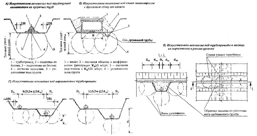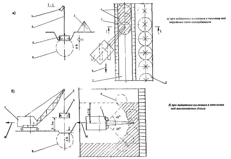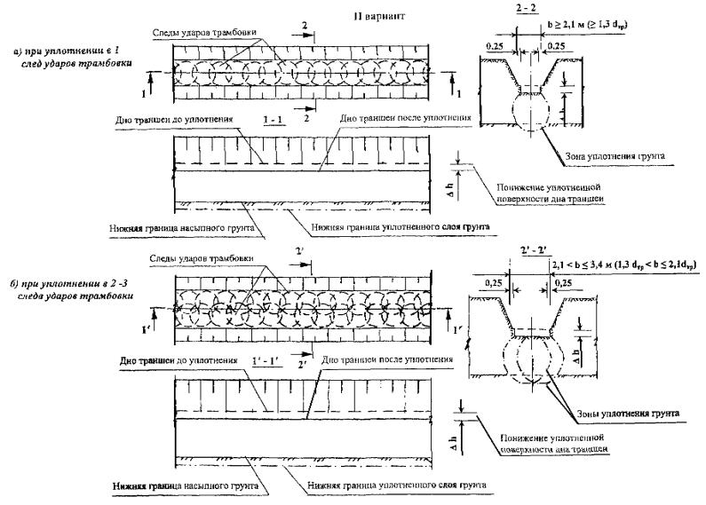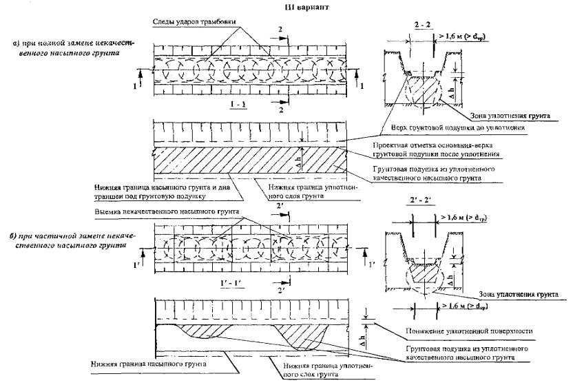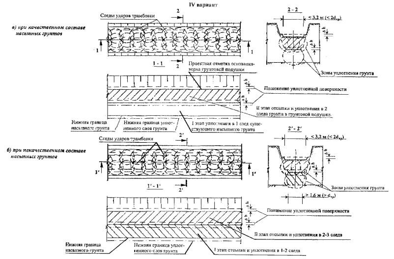 КАРТА Москва 2001 Рекомендовано к распространению решением Научно-технического совета ЦНИИОМТП. Технологическая карта составлена на процесс устройства искусственных оснований наружных сетей и малоэтажных (малонагруженных) зданий на насыпных грунтах для гражданского и промышленного строительства в инженерно-геологических условиях г. Москвы. Карта содержит четыре варианта устройства искусственных оснований с использованием их подготовки методом уплотнения насыпных грунтов тяжелыми свободно падающими трамбовками. Предназначена для использования оргтехстроями, строительно-монтажными организациями при разработке проектно-сметной документации и проектов производства работ. Карта разработана в ЦНИИОМТП кандидатом технических наук Ковалевым А.С. при участии зав. сектором компьютерных и информационных технологий Ягудаева Л.М. 1. ОБЩИЕ ПОЛОЖЕНИЯПодготовка оснований под наружные сети и малоэтажные (малонагруженные) здания в насыпных грунтах путем их уплотнения различными методами нашло достаточно широкое применение на строительных объектах в микрорайонах Орехово-Борисово, Митино, Новокосино, Москворечье, Братеево, Люблино и т.д. Способность насыпных песчаных и пылевато-глинистых грунтов при их уплотнении (доуплотнении) приобретать новые более высокие прочностные характеристики, обеспечивающие длительную и надежную эксплуатацию оснований указанных типов сооружений, позволяет резко сократить затраты по сравнению с применяемыми традиционными конструкциями искусственных оснований. К последним, в частности, относятся сборно-монолитные и железобетонные ленты и плиты, сборные стеновые блоки и балки, железобетонные сваи и ростверки и т.п. при устройстве наружных сетей. При устройстве малоэтажных зданий-объектов соцкультбыта, ТЦП и т.п., как правило, вполне возможна замена фундаментов глубокого заложения на фундаменты мелкого заложения, например, свайных фундаментов на сборные ленточные. Сущность предлагаемого технологического процесса заключается, таким образом, в том, что основание, подготовленное методом уплотнения насыпных грунтов, позволяет при устройстве наружных сетей и малонагруженных зданий применять существующие их конструкции, как на естественных основаниях. Все работы при устройстве оснований методом уплотнения осуществляют в соответствии с требованиями действующих нормативных документов: СНиП 2.02.01-83*; СНиП 3.02.01-87; Пособие по производству и приемке работ по основаниям и фундаментам (к СНиП 3.02.01-87), СНиП 3.05.04-85 и др., а также машинами и механизмами, серийно выпускаемыми отечественной промышленностью. 2. ОБЛАСТЬ ПРИМЕНЕНИЯ2.1. Технологическая карта составлена на процесс устройства искусственных оснований в насыпных грунтах в зависимости от их вида, состава, физико-механических характеристик, толщины слоя, в том числе с включениями минеральных отходов строительного, промышленного производств и содержанием органических веществ более 0,1 по весу. 2.2. В технологической карте рассмотрены четыре варианта устройства искусственных оснований: на существующем качественном насыпном грунте; с подготовкой основания методом трамбования существующих качественных насыпных грунтов тяжелыми трамбовками; с полной или частичной заменой некачественных насыпных грунтов подушкой из качественного грунта; с двухсл