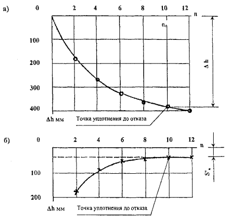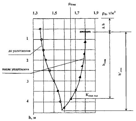 Приложение 1РЕКОМЕНДАЦИИ ПО УСКОРЕННОМУ КОНТРОЛЮ КАЧЕСТВА УПЛОТНЕНИЯ ГРУНТОВ ТЯЖЕЛЫМИ ТРАМБОВКАМИ1. ОБЩИЕ ПОЛОЖЕНИЯ 1.1. Ускоренный контроль качества уплотнения грунтов тяжелыми трамбовками включает: а) проведение перед началом работ опытного уплотнения грунта; б) определение величин понижения уплотненной поверхности Dh; в) контрольное трамбование грунта для определения величин отказа Sa, т.е. понижения уплотненной поверхности за 1 удар трамбовки; г) сопоставление величин Dh и Sa, полученных при опытном уплотнении и на контролируемом пункте. 1.2. Для ускоренного контроля качества уплотнения грунтов необходимы: технический нивелир с рейкой; кран-экскаватор с трамбовкой; металлические штыри-марки, представляющие собой отрезки арматуры длиной 10 - 40 см, диаметром 10 - 25 мм. 1.3. Ускоренный контроль качества уплотнения грунтов по величине понижения уплотненной поверхности и «отказу» рекомендуется применять при: а) оперативном контроле в полевых условиях за качеством уплотнения грунтов при заданном коэффициенте уплотнения их Kcom £ 0,97; б) уплотнении грунтов тяжелыми трамбовками с плоским основанием; в) уплотнении крупнообломочных, песчаных, пылевато-глинистых грунтов и подобным им экологически чистых отходов промышленных производств, имеющих влажность, близкую к оптимальной или изменяющейся в допускаемом диапазоне ее значений *; г) проверка качества ранее уплотненных грунтов трамбованием, укаткой, вибрацией и др. воздействиями при их суммарной толщине не более 1,5dтр (2,5 - 3 м); д) содержании органических включений в уплотненном грунте не более 0,1. *Примечания. 1. За допускаемый диапазон изменения влажности уплотняемого грунта DW принимается разность по кривой стандартного уплотнения между максимальной и минимальной влажностями, при которых достигается заданная плотность ρdзад (коэффициент уплотнения Kcom) уплотненного грунта. 2. Проверку качества уплотнения ранее уплотненных различными методами грунтов допускается выполнять только по величине «отказа». 2. ОПЫТНОЕ УПЛОТНЕНИЕ 2.1. Опытное уплотнение грунтов тяжелыми трамбовками выполняют с целью определения: величины понижения уплотненной поверхности Dh при уплотнении до «отказа» *; отказа Sa, т.е. величины понижения уплотненной поверхности от 1 удара трамбовки при уплотнении до «отказа»; количества ударов трамбовки n0, необходимого для уплотнения до «отказа»; глубины уплотнения грунта hcom при заданных размерах, массе трамбовки, режиме трамбования. * Примечание. Уплотнением до «отказа» называют такое состояние уплотняемого грунта, при котором достигаются максимальная плотность и наибольшая глубина уплотнения, в результате чего при последующем уплотнении понижение уплотняемой поверхности от каждого удара становится постоянным. 2.2. Опытное уплотнения производят теми же механизмами и трамбовками при той же высоте их сбрасывания, что и при производственном уплотнении для всех видов грунтов, отходов производств и наиболее характерных их смесей. Размеры участков принимаются равными: шириной не менее 2dтр, длиной не менее 3dтр (dтр - диаметр трамбовки) с учетом уплотнения грунта в 2´3 следа ударов трамбовки (Рис. 1). Рис. 1. Схема опытного уплотнения тяжелыми трамбовками 1 - штыри; 2 - следы трамбовки; 3 - шурф для определения плотности уплотненных грунтов 2.4. Поверхность опытного участка выравниваю