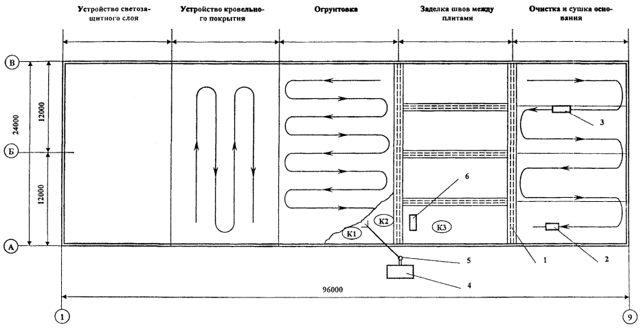 3. ТРЕБОВАНИЯ К КАЧЕСТВУ И ПРИЕМКЕ РАБОТ3.1. В процессе выполнения кровельных работ контроль осуществляет заказчик, сверяя требования к качеству с настоящей технологической картой, и представитель строительной организации. 3.2. В процессе приемки выполненной кровли комиссионно тщательно осматривают всю кровлю, обращая особое внимание на правильность и качество выполненных примыканий к выступающим над крышей конструкциям и воронкам. 3.3. Водонепроницаемость проверяют после дождя, однако заказчик вправе потребовать заливку кровли с предварительной временной герметизацией водоотводов. 3.4. На поверхности кровли, подлежащей сдаче заказчику, не должно быть воздушных «мешков» (вздутий), не должно быть обратных уклонов, сползаний мастики с мест примыканий. При обнаружении дефектов или недоделок заказчик вправе требовать немедленного их устранения. 3.5. При длительном хранении компонентов мастики Битурэл, особенно в отапливаемом складе, следует в лабораторных условиях проверить технологические свойства, проверив прежде всего жизнеспособность мастики и адгезию к бетону. 3.6. Пооперационный контроль качества работ по устройству кровли выполняется в соответствии с требованиями СНиП III-1-76 «Организация строительного производства». 3.7. В процессе подготовки и выполнения кровельных работ проверяют: качество применяемых материалов и их соответствие требованиям действующих ГОСТов и технических условий, качество приготовления мастичного материала, качество выполнения отдельных видов работ, готовность отдельных конструктивных элементов покрытия для выполнения последующих работ: устройство усилений в ендовах, у водосточных воронок, карнизов, коньков; устройство деформационных швов; устройство защитного слоя. Результаты проверок следует заносить в журнал работ. Приемка законченной кровли сопровождается контрольной проверкой и тщательным осмотром ее поверхности, особенно у воронок и в местах примыканий к выступающим конструкциям. 3.8. На скрытые работы составляются акты (с оценкой качества работ) по устройству следующих конструктивных элементов: основания под кровлю, в том числе в местах примыкания к выступающим элементам; дополнительных слоев ковра в местах установки водосточных воронок, ендовах и у примыканий кровли к выступающим конструктивным элементам. 3.9. Качество поверхности основания под мастичный кровельный ковер, а также участков усиления мастичного ковра определяется осмотром. При этом необходимо, чтобы: на покрытии не оставалось не заделанных швов, крупных пор или не срубленных острых выступающих частей конструкций, что может привести к повреждению кровельного ковра; была соблюдена плавность выкружки в местах примыканий и обеспечена высокая степень адгезии грунтовки с основанием; тщательно наклеены полотнища армирующих материалов, особенно в местах примыканий мастичного ковра к выступающим элементам и водоприемным воронкам, особенно необходимо обращать внимание на полную пропитку рулонных стекломатериалов мастикой Битурэл. Нанесение каждого последующего слоя допускается только после тщательной проверки качества высыхания предыдущего слоя. Каждый отдельный слой, как и мастичный ковер в целом, должен быть сплошным, не иметь раковин, вздутий и отслоений. 3.10. Проверке с помощью щупа подлежит толщина сл