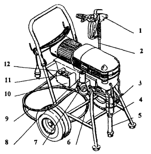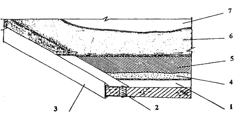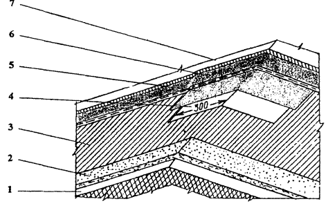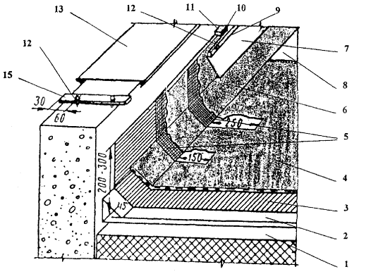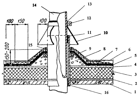 1 - швы между плитами; 2 - компрессор СО-243-1; 3 - машина СО-222 (при необходимости); 4 - установка для транспортирования мастики; 5 - трубопровод для подачи мастики на кровлю; 6 - кран крышевой К-1, КБК-2 или аналогичные Рис 6. Схема устройства кровли из мастики 1 - пистолет-распылитель; 2 - гибкая вставка шланга 2,5 м; 3 - насос подачи материала; 4 - накидная гайка; 5 - всасывающий патрубок с фильтром; 6 - разгрузочный вентиль; 7 - манометр; 8 - фильтр высокого давления; 9 - рукав высокого давления 15 м; 10 - распределительная коробка; 11 - регулятор давления; 12 - магнитный пускатель (220-230 В) Рис. 7. Универсальная передвижная установка фирмы Вагнер марки ЕР3000 1 - основание под кровлю; 2 - основной кровельный ковер из Битурэла; 3 - дополнительный водоизоляционный слой из Битурэла Рис. 8. Устройство мастичной кровли на ендове 1 - несущая плита; 2 - пароизоляционный ковер; 3 - теплоизоляционный слой; 4 - армированная выравнивающая стяжка; 5 - основной слой ковра; 6 - слои дополнительного ковра с локальной армирующей прокладкой из стеклоткани на ендове; 7 - то же, вокруг водосточной воронки; 8 - водоприемный колпак с глухой крышкой; 9 - накидная гайка с шайбой; 10 - зажимной хомут; 11 - чаша водоприемной воронки Рис. 9. Усиление кровли в месте установки воронки внутреннего водостока 1 - утеплитель; 2 - основание под кровлю (выравнивающая стяжка); 3 - грунтовка; 4 - армирующая прокладка из стекломатериала дополнительного водоизоляционного ковра; 5 - слой мастики; 6 - основной мастичный водоизоляционный ковер; 7 - защитный слой с покраской АЛ-177 Рис. 10. Устройство мастичной кровли на коньке 1 - плита покрытия; 2 - уголок 50×50 мм по всей длине; 3 - вставка из листовой стали толщиной 3-4 мм; 4 - выравнивающая затирка по плитам покрытия; 5 - пароизоляция; 6 - утеплитель; 7 - выкружка из оцинкованной кровельной стали; 8 - полоска рубероида насухо; 9 - основание под кровлю; 10 - огрунтовка; 11 - рубероид насухо; 12 - армирующая прокладка из стекломатериала дополнительного водоизоляционного ковра; 13 - слой из мастики; 14 - основной мастичный водоизоляционный ковер; 15 - защитный слой Рис. 11. Устройство деформационного шва с металлической вставкой (в покрытиях с пароизоляцией) 1 - карнизный блок; 2 - антисептированные деревянные вкладыши; 3 - фартук из оцинкованной кровельной стали; 4 - выравнивающая затирка из цементно-песчаного раствора; 5 - грунтовка; 6 - основной мастичный водоизоляционный ковер; 7 - защитный слой с покраской АЛ-177 Рис. 12. Устройство мастичной кровли на карнизе 1 - плита покрытия; 2 - пароизоляция; 3 - утеплитель; 4 - основание под кровлю (стяжка); 5 - основной мастичный гидроизоляционный ковер; 6- защитный слой; 7 - армирующая прокладка из стекломатериала дополнительного водоизоляционного ковра; 8 - рамка из уголков 20×35 мм, предохраняющая мастику от растекания; 9 - зонт из оцинкованной кровельной стали; 10 - просмоленная пакля; 11 - хомут; 12 - мастика Битурэл или герметики (см. Таблицу 3); 13 - пропускаемая труба; 14 - патрубок с фланцем Рис. 13. Устройство мастичной кровли в местах пропуска трубы с усилением герметизирующими мастиками 1 - плита покрытия; 2 - пароизоляция; 3 - утеплитель; 4 - выравнивающая стяжка; 5 - основной мастичный кровельный ковер; 6 - защитный слой; 7 - армирующая прокладка из стекломатериала дополнительного водоизоляционного ковра; 8 - бетон или раствор проектной марки 50; 9 - антисептированный деревянный брусок 50×50 мм; 10 - зонт из о