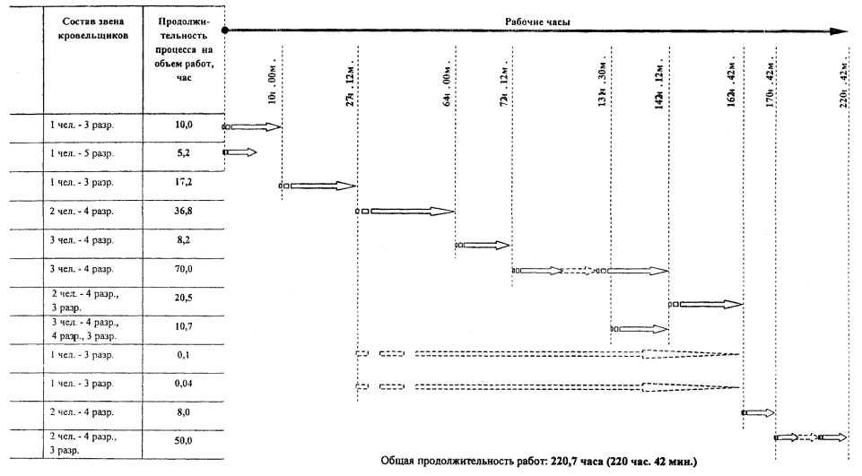 Примечания: 1. Нормами и расценками предусмотрено производство работ на высоте до 15 м от уровня земли. При производстве работ на высоте более 15 м нормы затрат труда и заработной платы следует увеличить на 0,5 % на каждый последующий метр высоты. 2. При определении цены Битурэла франко-стройплощадка учтены затраты на его транспортировку автотранспортом на расстояние до 100 км. 3. Стоимостные показатели приведены по состоянию на 01.05.1998 г. 5. ГРАФИК ПРОИЗВОДСТВА РАБОТ