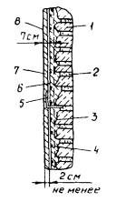 Первые трое суток с момента нанесения набрызгбетона, а также в солнечные дни число увлажнений следует увеличивать в 1,5 раза по сравнению с данными, которые приведены выше. Вода для поливки набрызгбетона должна удовлетворять требованиям, предъявляемым к воде для затворения тяжелого бетона, предусмотренным ГОСТ 23732-79. В пасмурную погоду увлажнение набрызгбетона следует производить не позднее 8 - 10 ч после его нанесения, а в жаркую ветреную - через 2 - 3 ч. При относительной влажности воздуха более 80 % покрытие достаточно поливать один раз в сутки, а при температуре наружного воздуха 5 - 8 °С поливать не следует. 7.22. Передвижение людей по забетонированному участку, a также монтаж на нем строительных лесов и опалубки производят после достижения набрызгбетоном прочности не менее 2 МПа. 8. МЕТОДЫ КОНТРОЛЯ КАЧЕСТВА И ПРИЕМКИ РАБОТ8.1. Высокое качество строительства, ремонта и усиления конструкций достигается: применением компонентов смеси, удовлетворяющих ГОСТ; качественной подготовкой поверхности здания и сооружения; получением однородных сухих и затворенных водой смесей; тщательностью изготовления покрытия, конструкции; соблюдением установленных сроков ухода за бетоном. 8.2. Физико-механические свойства набрызгбетона и внешний вид построенных, отремонтированных или усиленных конструкций зависят от квалификации рабочих, ведущих бетонирование, а также от тщательности пооперационного контроля. Качество готового покрытия (конструкции) в большой степени зависит от того, насколько умело владеет сопловщик техникой нанесения бетонной смеси. Небрежное ведение сопла или недостаточная опытность сопловщика приводят к непривлекательному виду поверхности, неравномерной шероховатости, большому числу «затуманенных» мест и пятен, а также наличию растрескавшихся, оплывших или отслоившихся участков. 8.3. Качество цемента в хранилищах проверяют один раз в неделю, а также при поступлении новой партии путем изготовления и испытания образцов по ГОСТ 310.4-81*. 8.4. Среднюю толщину свежеуложенного слоя набрызгбетона следует измерять при помощи заостренного щупа диаметром 5 мм, погружаемого в слой с шагом 0,5 м. 8.5. Чтобы избежать появления «затуманенных» мест, бетонирование следует вести по возможности непрерывно в пределах каждой захватки. 8.6. Набрызгбетон неудовлетворительного качества (смывы, отслоения и т.д.) подлежит удалению сразу после нанесения. 8.7. По истечении двух недель после нанесения набрызгбетона необходимо простучать молотком все отремонтированные (усиленные) поверхности с тем, чтобы выявить наличие или отсутствие пустот или отслоившихся частей покрытия. Дефектные участки площадью более 0,5 м2 после вырубки очищают, промывают и снова покрывают набрызгбетоном; площадью менее 0,5 м2 заделывают раствором на основе расширяющегося цемента. 8.8. Оперативный контроль прочности набрызгбетона следует проводить с помощью эталонного молотка Кашкарова в соответствии с ГОСТ 22690.2-77. 8.9. При возведении, ремонте и усилении ответственных элементов конструкции необходимо изготовлять контрольные образцы, отбирая четыре пробы материала в течение рабочей смены для четырех серий образцов. Для изготовления контрольных образцов из набрызгбетона следует использовать коробчатую опалубку размером не менее 50 ´ 50 см (одна проба). Образцы должны иметь ту же то