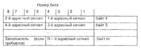 1111 - резерв Если кодирование осуществляется в двоично-десятичном коде, то адресная информация глобального заголовка, начиная с 4-го байта, кодируется согласно рисунку 2. Рисунок 2 - Формат адресной информации глобального заголовка - тип индикатора адреса кодируется следующим образом: биты 7654321 0000000 - тип индикатора адреса не известен 0000001 - номер абонента 0000010 - зарезервирован для национального использования 0000011 - полный национальный номер (междугородный) 0000100 - международный номер