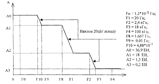 n - номер разряда в канальном интервале КИ 0 цикла, не содержащего синхросигнал, отведенный для передачи сообщения о приоритете и качестве источника сигнала сетевой тактовой синхронизации. Причем, n может принимать значения 4, 5, 6, 7 или 8 в зависимости от выбора персонала (т.е. только один Sa разряд). 5.1.7.8 Структура сверхциклового синхросигнала, используемого для контроля по циклическому коду, имеет вид - 001011. Сверхцикловой синхросигнал передается в циклах с номерами 1, 3, 5, 7, 9 и 11. 5.1.8 Параметры цикловой синхронизации 5.1.8.1 Критерием нарушения цикловой синхронизации является обнаружение ошибки в трех синхросигналах подряд или обнаружение три раза подряд отсутствия "единицы" в разряде Р2 канального интервала КИ0 в циклах, не содержащих цикловой синхросигнал. Цикловая синхронизация также считается нарушенной при невозможности достижения сверхцикловой синхронизации по циклическому коду за 8 мс или при превышении установленного числа ошибочных сообщений в циклическом коде [10]. 5.1.8.2 Критерием восстановления цикловой синхронизации является регистрация следующих событий в трех последовательных циклах: - наличие неискаженного циклового синхросигнала в цикле (n); - отсутствие циклового синхросигнала в цикле (n+1), при этом разряд Р2 должен иметь значение "единицы"; - наличие неискаженного синхросигнала в цикле (n+2). Невыполнение критериев восстановления цикловой синхронизации хотя бы по одному из указанных признаков приводит к продолжению поиска оборудованием стыка состояния цикловой синхронизации начиная с цикла (n+2). При осуществлении контроля по циклическому коду (CRC-4), если после восстановления цикловой синхронизации сверхцикловая синхронизация по циклическому коду (CRC-4) не достигнута за 8 мс (приняты не менее двух сверхцикловых синхросигналов), то должно считаться, что цикловая синхронизация получена за счет ложного циклового синхросигнала и должен быть осуществлен новый поиск цикловой синхронизации. 5.1.9 Размах допускаемого синусоидального изменения фазы цифрового сигнала (фазовое дрожание и дрейф фазы) на входе цифровой АТС, при котором обеспечивается отсутствие ошибок в цифровом потоке внутри AТC, должен быть не более значений, определяемых шаблоном рисунка 3 [11]. А - полный размах синусоидального фазового дрожания и дрейфа фазы принимаемого цифрового сигнала (логарифмическая шкала), измеренный в единичных интервалах (ЕИ). Значение одного ЕИ - 488 нс. F - частота синусоидального фазового дрожания и дрейфа фазы принимаемого цифрового сигнала (логарифмическая шкала), измеренная в Гц (кГц). Рисунок 3 Сигнал интерференционной помехи, воздействующей на входной сигнал, представляет собой сигнал в коде НDB-3 со скоростью передачи, допустимой на стыке, но асинхронный по отношению к входному полезному сигналу. Двоичное содержание сигнала интерференционной помехи - псевдослучайная последовательность (215-1) битов. 5.1.13 Размах фазового дрожания сигнала на выходе цифровой АТС, измеренный с использованием полосового фильтра с граничными частотами 20 Гц и 100 кГц и спадом логарифмической амплитудно-частотной характеристики 20 дБ на декаду [12], не должен превышать 0,05 ЕИ. Для подстанций размах фазового дрожания выходного сигнала, измеренный с использованием полосового фильтра с граничными частотами 20 Гц и 100 кГц и спадом логарифмической амплитудно-ч