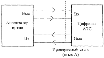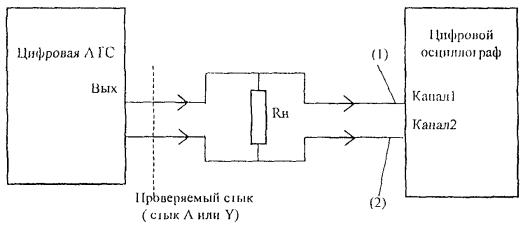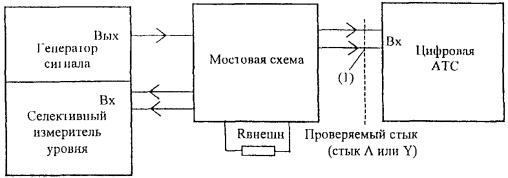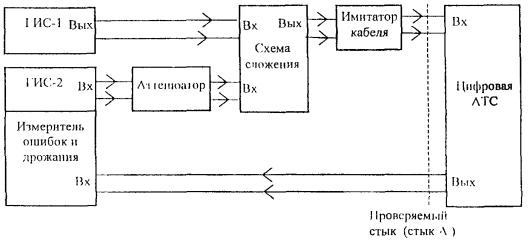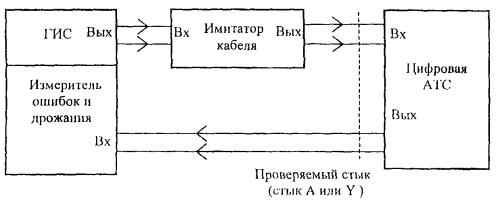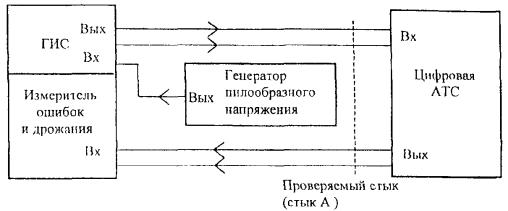 Выход цифровой АТС по проверяемому стыку А включен в измерительное плечо мостовой схемы. При подаче сигналов от генератора в одну из диагоналей мостовой схемы селективным измерителем уровня, который включен в другую диагональ мостовой схемы, измеряются уровни сигналов, характеризующие затухание несогласованности в диапазоне частот от 51 до 3072 кГц. Измерение затухания несогласованности проводится на частотах: 51, 70, 102, 500, 1000, 2048 и 3072 кГц. Измеренные значения затухания несогласованности должны соответствовать значениям, указанным в 5.1.5. При отсутствии мостовых схем допускается проводить измерение согласно 7.1.3 ОСТ 45.90, но данный метод является менее точным. 6.2.7 Измерение затухания несогласованности относительно входного сопротивления 120 Ом по 5.1.6 Измерение затухания несогласованности относительно входного сопротивления 120 Ом проводится по схеме, приведенной на рисунке 9. Rвнешн. = (120 ± 0,3) Ом (1) - измерительный кабель длиной не более 0,3 м. Рисунок 9 Вход цифровой АТС по проверяемому стыку включен в измерительное плечо мостовой схемы. При подаче сигналов от генератора в одну диагональ мостовой схемы селективным измерителем уровня, который подключен к другой диагонали мостовой схемы, измеряются уровни сигналов, характеризующие затухание несогласованности в диапазоне частот от 51 до 3072 кГц. Измерение затухания несогласованности проводится на частотах: 51, 70, 102, 500, 1000, 2048, 3072 кГц. Измеренные значения должны соответствовать значениям, указанным в 5.1.6. При отсутствии мостовых схем допускается проводить измерение согласно 7.2.1 ОСТ 45.90, но данный метод является менее точным. 6.2.8 Проверка устойчивости работы цифровой АТС к фазовому дрожанию входного цифрового сигнала по 5.1.9 Проверка устойчивости работы АТС к фазовому дрожанию входного цифрового сигнала проводится по схеме, приведенной на рисунке 10. При этом проводится измерение максимального значения синусоидального фазового дрожания сигнала на входе цифровой АТС, которое не вызывает появления ошибок в оборудовании испытываемого стыка, и при котором не возникает ложных срабатываний аварийной сигнализации на стыке А. Рисунок 10 С выхода ГИС цифровой сигнал с фазовым дрожанием через имитатор кабеля подается на вход проверяемого стыка. Фазовое дрожание вводится с частотами от 10 Гц до 100 кГц. Цифровая АТС производит коммутацию произвольно выбранного канального интервала (например КИ1) цифрового сигнала. Тестовая последовательность, передаваемая с выхода ГИС в выбранном канальном интервале, - псевдослучайная последовательность (215-1) [14]. Размах фазового дрожания с выбранной частотой на выходе ГИС увеличивается до появления ошибок в проверяемом канале цифрового сигнала, фиксируемых измерителем ошибок и дрожания. Измеренные максимальные значения фазового дрожания, которые не вызывают ошибок в проверяемом канале цифрового сигнала, должны быть выше значений, указанных в 5.1.9 (рисунок 3). Измерение проводится при затухании 0 дБ и 6 дБ, которое вносится имитатором кабеля. 6.2.9 Проверка устойчивости работы цифровой АТС к фазовым скачкам входного цифрового сигнала по 5.1.10 Измерение максимального значения фазового скачка цифрового сигнала на входе цифровой АТС, который не вызывает появление ошибок или ложных срабатываний аварийной сигнализации на испытываемом стыке проводится по схеме, приве
