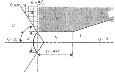 В этих формулах: E0, определяется в соответствии с (2.36), α = 0,316, коэффициенты дифракции рассчитываются по формулам (2.28)...(2.32). Переход к декартовым составляющим дифракционного поля осуществляется по формулам (2.39), а к сферическим компонентам ППЭ по формулам (2.38). В секторе углов подобласти II-в следует принять, что Пдиф = 0. Расчет плотности потока энергии в области III. Если зеркало антенны длиннофокусное (ψ < 90°), то в области III ППЭ имеет две составляющие. Одна определяется излучением облучателя, другая - дифракцией на части кромки: ПΣ = Побл + Пдиф (2.42) Составляющая Побл, определяется по формуле (2.23) с последующим переходом к мкВт/см2, а составляющая Пдиф также, как для подобласти II-б. В случае короткофокусной антенны (ψ < 90°) в области III ППЭ имеет составляющие Пдиф и Па. Составляющая Пдиф рассчитывается так же, как для подобласти II-а - по формулам (2.28)...(2.38). Расчет плотности потока энергии в области IV. В области IV ППЭ определяется в основном составляющими Побл и Пдиф, поэтому значение ППЭ в этой области формально определяется по формуле (2.42) с добавлением составляющей Па. При этом дифракционная составляющая поля определяется так же, как это сделано в подобласти II-а - по формулам (2.28)...(2.38). Расчет плотности потока энергии в области V. В этой области ППЭ следует определять следующим образом: ПΣ = Побл + Пдиф При