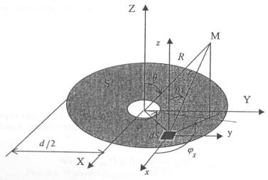 рис. П1.1 (приложение 1) приведена функция На рис. 2.3 показана круглая апертура с центральным затенением (затенение моделируется отсутствием элементов Гюйгенса в центре апертуры - светлый круг). Поле в точке М является суперпозицией полей элементов Гюйгенса dS, расположенных на поверхности раскрыва (апертуре). Рис. 2.3. К расчету функции F(u, x). Напряженность электрического поля, создаваемая в расчетной точке М всей совокупностью элементов Гюйгенса, находящихся в апертуре, определяется следующей формулой: