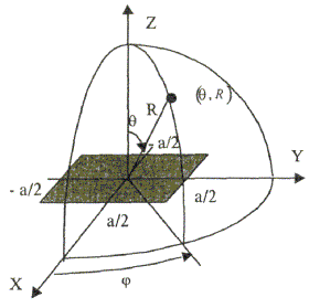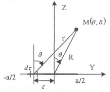 определена граница раздела между областями IV и V (значение Алгоритм определения областей и подобластей для расчетной точки и примеры расчета ППЭ приведены в приложении 2 - рис. П1.3 и П1.4. Примеры расчета ППЭ вблизи параболических антенн с круглой апертурой приведены в приложении 2. 3. Расчет плотности потока энергии вблизи параболических антенн с квадратной и прямоугольной апертуройКвадратная апертура. При анализе квадратной апертуры (рис. 3.1) используются допущения: - распределение амплитуды поля в одной из главных плоскостей - «косинус на пьедестале»: а - сторона квадрата, τ - текущее значение координаты апертуры в одной из главных плоскостей; · облучатель и антенна имеют характеристики направленности с осевой симметрией относительно направлений их максимального излучения; · значение характеристики направленности облучателя вне сектора углов перехвата энергии основным зеркалом равно 0,316 (по напряженности поля). Рис. 3.1. Квадратная апертура. Общая расчетная формула для определения значения ППЭ имеет вид (2.1). Физический смысл отдельных составляющих прежний. Составляющие Па и Побл в децибелах относительно 1 мкВт/см2 будут иметь вид: Р - мощность, излучаемая антенной, Вт; λ - длина волны, м; а - сторона квадрата (апертуры антенны), м; D0 - КНД антенны в направлении максимального излучения в волновой зоне; В(х) - функция, учитывающая изменение КНД квадратной апертуры в зависимости от относительного расстояния; F(u ,x) - нормированная ХН квадратной апертуры в координатах и, х; θ, R - сферические координаты расчетной точки; и = (πa sin θ) / λ - обобщенная координата угла; х = R / Rгр - относительное расстояние; Rгр = 2а2 / λ - граничное расстояние. Dобл - КНД облучателя в направлении максимального излучения (величина безразмерная). График зависимости Dобл,дБ = 10 lg Dобл как функции аргумента ψ0 для усредненной модели антенн приведен на рис. П1.2 (приложение 1). Вычисление функции F(u, x) сводится к расчету характеристики направленности линейного синфазного источника (рис. 3.2) с распределением амплитуды тока, совпадающем с распределением амплитуды поля вида (3.1). Рис. 3.2. К расчету характеристики направленности. Значение напряженности поля в расчетной точке определяется выражением: В (3.5) f(τ) определяется распределением поля, а геометрические параметры υ, r являются функциями θ, R. Нормированная характеристика направленности апертуры имеет вид: В терминах обобщенных координат (и, х) направленные свойства апертуры будут характеризоваться функцией F(u, x). Функции F(u, x) сильно осциллирующие, поэтому в практических расчетах ППЭ следует использовать их гарантированные огибающие. Для удобства практических расчетов гарантированные огибающие табулированы (приложение 3, таблицы 3.1 и 3.2). При значениях х > 1, что соответствует дальней зоне, необходимо пользоваться огибающими для х = 1. Аналитическое выражение функции В(х)/х для квадратной апертуры с амплитудным распределением типа «косинуса на пьедестале» имеет вид: где