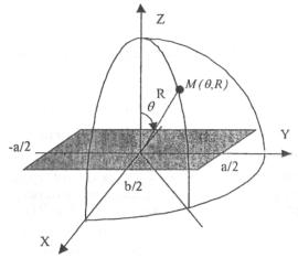 Угол раскрыва эквивалентной апертуры определяется по формуле: f - фокусное расстояние зеркала. Прямоугольная апертура. Прямоугольная апертура со сторонами a и b показана на рис. 3.3. Рис. 3.3. Прямоугольная апертура. Расчетная формула для апертурной составляющей ППЭ имеет вид: Функции F(u,x), входящие в (3.13), вычисляются в соответствии с (3.4)...(3.6) с учетом перехода к обобщенным координатам и и x, а функции В(х)/х - по формуле (3.7) при х = х1 и х = х2, соответственно. Расчет составляющей ППЭ от облучателя выполняется по формуле (3.3). КНД облучателя следует рассчитывать по формуле: D1 и D2 определяются по формулам (2.15) и (2.16) с учетом различных значений угла ψ0 в главных плоскостях. Диаметр эквивалентной круглой апертуры, необходимый для расчета дифракционной составляющей ППЭ, определяется из условия равенства площадей прямоугольной и круглой апертур:
