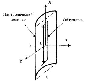 Угол раскрыва эквивалентной круглой апертуры определяется по формуле (3.12). Примеры расчета ППЭ вблизи параболических антенн с квадратной и прямоугольной апертурами приведены в приложении 3. 4. Расчет плотности потока энергии вблизи антенн типа параболический цилиндр и рупорных антеннАнтенна типа параболический цилиндр. Антенна имеет прямоугольную апертуру (рис. 4.1). Распределение амплитуды поля вдоль сторон апертуры в главных плоскостях XOZ и ZOY равномерное. Методика расчета ППЭ соответствует случаю прямоугольной апертуры при f(τ) = const. Огибающие F(u, x) для случая f(τ) = const отличаются от аналогичных кривых, соответствующих распределению (3.1) не существенно (единицы дБ). Поэтому в практических расчетах можно использовать данные, приведенные в табл. П3.1 и табл. П3.2. Значение КНД облучателя рассчитывается по формуле: L - длина облучателя;