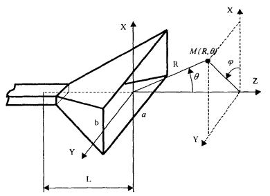 В области заднего полупространства расчет ППЭ следует вести по формуле (3.3), приняв Dобл = D0. Рис. 4.1. Антенна типа параболический цилиндр. Пирамидальный рупор. Пирамидальные (рис. 4.2) и конические (рис. 4.3) рупорные антенны имеют апертуры с неравномерным и несинфазным возбуждением. Линейные размеры апертур обычно измеряются единицами, реже десятками длин воли Расчетные точки, находящиеся на расстоянии нескольких метров от таких антенн, относятся к дальней (волновой) зоне. Плотность потока энергии в переднем полупространстве вблизи таких антенн рассчитывается по формуле: Р - мощность, изучаемая антенной, Вт; F(θ, φ) - характеристика направленности рупора; Dp - КНД рупора. Рис. 4.2. К расчету ППЭ вблизи пирамидального рупора. Для пирамидального рупора в расчетах следует принять: сомножители - это нормированные характеристики направленности рупорной антенны в E и H плоскостях. Для расчета характеристики направленности в плоскости Е (φ = 0) сначала вычисляется функция: