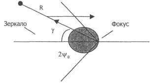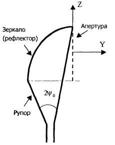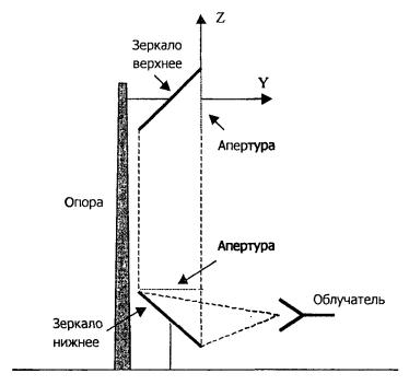 Рис. 4.3. К расчету ППЭ вблизи конического рупора. Примеры расчетов ППЭ вблизи антенн типа параболический цилиндр, пирамидального и конического рупора приведены в приложении 4. 5. Расчет плотности потока энергии вблизи рупорно-параболической и перископической антеннКонструкция типовой рупорно-параболической антенны (РПА) схематично представлена на рис. 5.1. Апертуру можно считать квадратной с размером 2,7 × 2,7 м2. Методика расчета ППЭ в переднем полупространстве (Y > 0) соответствует приведенной в разделе 3 для квадратной апертуры с распределением амплитуды поля (3.1) - «косинус на пьедестале». Составляющая Па рассчитывается по формуле (3.2), составляющая По6л - по формуле (3.3). При этом угол раскрыва рупора 2ψ0 = 35°. Учитывая, что РПА обладает хорошим защитным действием (уровень бокового излучения исключительно низок: почти во всем секторе углов он не превосходит -60...-70 дБ), дифракционную доставляющую и составляющую По6л при расчете ППЭ в области заднего полупространства (Y < 0) не учитывать. Рис. 5.1. Рупорно-параболическая антенна. Перископические антенные системы (ПАС) обычно строятся по трехэлементной схеме (рис. 5.2) - первичный рупорный облучатель, нижнее зеркало и верхнее зеркало. Диаметр верхнего зеркала 3,9 м, нижнего 3,2 м. Диаметры апертур с учетом наклонного положения зеркал следует брать равными 0,7 реальных диаметров зеркал. В общем случае значение ППЭ в произвольной точке пространства M определяется тремя составляющими, каждая из которых соответствует одной из трех антенн - Al, A2, A3 (рис. 5.3). Антенна А1 рупорная. Её вклад в значение ППЭ определяется в соответствии с методикой, изложенной в разделе 4. Антенны А2 и A3 имеют круглые апертуры. Их вклад в значение ППЭ определяется апертурными составляющими, которые рассчитываются по формуле (2.8). Вблизи поверхности земли значение ППЭ определяется в основном антенной А1 - облучателем, поэтому вклад апертурных составляющих верхнего и нижнего зеркала можно не учитывать. Рис. 5.2. Перископическая антенная система. В области Y < 0 следует ограничиться только составляющей от антенны А1, то есть не учитывать составляющие ППЭ, обусловленные дифракцией электромагнитных волн на зеркалах. Рис. 5.3. К расчету ППЭ вблизи ПАС. Примеры расчета ППЭ вблизи антенн РПА и ПАС приведены в приложении 5. 6. Учет влияния решетчатой структуры рефлектораРешетчатая структура рефлектора создает повышенный (по сравнению с зеркалом из сплошного листа) уровень ППЭ в области заднего полупространства антенны. При облучении рефлектора электромагнитной энергией происходит ее отражение (полезный эффект, связанный с формированием диаграммы направленности антенны) и частичное прохождение в область заднего полупространства (рис. 6.1). Рис. 6.1. Прохождение энергии через зеркало. Значение составляющей Ппр в точке М, находящейся в области заднего полупространства, определяется по формуле: Т - коэффициент прохождения волны через решетчатую структуру (по полю); Р - мощность излучения облучателя, Вт; Dобл - коэффициент направленного действия облучателя (величина безразмерная); Fобл(γ) - характеристика направленности облучателя (величина безразмерная); R - расстояние от фазового центра облучателя до расчетной точки М, м. Угловая зависимость коэффициента прохождения не учитывается. Значение T определяется для случая нормального падения плоской в