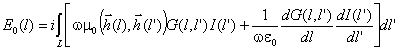 Вычислению векторов напряженности электрического и магнитного полей предшествует решение электродинамической задачи о нахождении функции распределения тока (токовой функции) в проводниках антенны при заданном возбуждении. Данная задача решается в приближении тонкого провода с использованием интегрального уравнения Харрингтона. При этом используется метод коллокации (метод сшивания в точках) при кусочно-синусоидальном базисе разложения токовой функции. Антенна представляется системой цилиндрических проводников, радиус которых не превышает 0,02λ. Проводники разбиваются определенным образом на короткие отрезки (сегменты), длина которых не превышает 0,1λ. Соседние сегменты (на одном проводнике) частично перекрываются: начало некоторого данного сегмента совпадает с центром предыдущего, конец - с центром последующего. Интегральное уравнение Харрингтона имеет вид: E0(l) - стороннее поле; L - контур, последовательно проходящий по осям всех проводников - вдоль данного контура отсчитываются криволинейные координаты l и l’ (см. рис. 7.1); ω - круговая частота; μ0 - магнитная постоянная; ε0 - диэлектрическая постоянная;