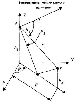 При т > М в формулах (7.7) и (7.8) в качестве коэффициентов Im, берутся соответствующие заданные входные токи: Im = I(вх)m-N, т > N. Пример расчета ППЭ вблизи вибраторной антенны приведен в приложении 7. 8. Учет влияния подстилающей поверхности (земли, крыши)Учет влияния плоской безграничной поверхности сводится к применению двухлучевой модели (рис. 8.1). Рис. 8.1. Двухлучевая модель распространения радиоволн. В точке В плотность потока энергии рассчитывается по формуле: П = П1 (θ1, φ1, r1) + П2 (θ2, φ2, r2), где (8.1) П1 (θ1, φ1, r1) - ППЭ, создаваемая прямой волной (луч АВ); П2 (θ2, φ2, r2) - ППЭ, создаваемая волной, распространяющейся по траектории АСВ;