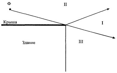 Обе составляющие рассчитываются по методике, соответствующей свободному пространству. Для учета влияния горизонтальной идеально проводящей плоскости конечных размеров выделяется три области, соответствующие приближению геометрической оптики (рис. 8.2): I - область прямых лучей, II - область интерференции прямых и отраженных лучей, III - область тени, в которой предполагается отсутствие поля. Рис. 8.2. Деление пространства на области. Исходными данными для учета конечных размеров крыши вдоль азимута φ (рис. 8.3) являются: координаты фазового центра Ф{0, 0, zФ}, координаты расчетной точки М{xM, yM, zm}, координаты углов крыши А{хA, уA, za}, В{хB, уB, zB]. Последовательность расчета: 1. Вычисляются значения некоторых вспомогательных параметров: 2. Определяются координаты точки К (точки пересечения кромки крыши АВ линии Оξ): · для φ ≠ · для φ = xK = 0, yK = aAB (8.7) 3. Рассчитываются расстояния: 4. В соответствии с алгоритмом, приведенном на рис. 8.4, определяется принадлежность точки М к одной из трех областей. 5. Приведенный порядок расчета повторяется для всех выбранных значений φ, соответствующих положению линии Оξ, внутри сектора углов АОВ. Рис. 8.3. К учету влияния горизонтальной крыши. Примечание. В приложении 9 приведена информация о рекомендуемом программном обеспечении, включающем в себя расчеты плотности потока энергии по приведенным выше методикам для рассмотренных технических средств. Рис. 8.4. Алгоритм определения области нахождения точки М. 9. Инструментальный контроль уровней электромагнитных полей радиосредств9.1. Инструментальный контроль уровней ЭМП проводится с целью определения фактического состояния электромагнитной обстановки в местах расположения излучающих радиосредств. Измерения проводятся: · на этапе предупредительного санитарного надзора (при приемке объекта в эксплуатацию); · на этапах текущего санитарного надзора (при изменении ситуационных планов размещения антенн, технических характеристик или режимов работы объекта; · после проведения защитных мероприятий, направленных на снижение уровней ЭМП; · в порядке плановых контрольных измерений (не реже одного раза в год). 9.2. Подготовка к проведению инструментального контроля включает несколько этапов: · согласование цели, времени и условий проведения измерений с заинтересованными организациями и предприятиями; · рекогносцировку района проведения измерений (подготовка информации о местности, рельефе, наличии переотражающих поверхностей, выбор трасс и точек измерений); · подготовку информации об источнике излучения (типы передающих средств, рабочие частоты, режимы и мощности, типы антенн, их параметры и пространственное положение); · изучение нормативной санитарно-гигиенической документации, относящейся к данному виду технических средств; · обеспечение измерений дальности до точки измерений; · подбор и подготовку необходимой измерительной аппаратуры; · выполнение расчетного прогнозирования; · определение необходимости использования средств индивидуальной защиты. 9.3. Для инструментального контроля используются измерители плотности потока энергии (ППЭ), к которым предъявляются следующие требования: · измерительная антенна (зонд, датчик поля) не должна существенно искажать структуру измеряемого поля; · измерительная антенна (зонд, датчик поля) должна иметь изотропную харак