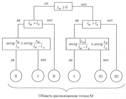 4. В соответствии с алгоритмом, приведенном на рис. 8.4, определяется принадлежность точек М1 и М2 к одной из трех областей. Суть этого алгоритма состоит в проверке нескольких условий. Так, для точки М1: zМ1 = 4 ≥ 0, lМ1 = lK Для точки М2: zМ2 = 1 ≥ 0, lМ2 = lK,