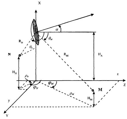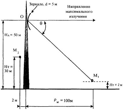 θ = 95,7106° 2. По алгоритму рис. П1.4 устанавливается принадлежность точки M2 к области IIб. Учитывая, что зеркало антенны короткофокусное 2ψ0 > 180°, поле в точке М2 будет определяться только дифракционной составляющей. 3. По формуле (2.41) рассчитывается Eθ = -7,256 × 10-2 + i1,273 × 10-2. При этом D2 = 0,114 - i0,107 (формулы (2.28)...(2.38)), Еθ = 18,827 (формула (2.36)). 4. Определяется ППЭ в точке М2 по формуле (2.38): П = 1,44 × 10-3 мкВт/см2 Вывод: ППЭ в точке М2 меньше ПДУ равного 10 мкВт/см2. Исходные данные и постановка задачи Техническое средство - ССП. Передатчик работает на длине волны λ = 0,05 м. Мощность передатчика Р = 3 кВт. Используется антенна Кассегрена с углом раскрыва 2ψ0 = 180° и D0 = 50 дБ. Диаметр апертуры d = 7 м. Высота центра апертуры над землей НА = 7 м. Направление максимального излучения составляет с плоскостью горизонта угол α = 10°. Рассчитать ППЭ в точках М и N. Исходные данные: НM = 2 м, φM = 5°, ρM = 300 м, HN = 4 м, φN = 160°, ρN = 20 м. Постановка задачи иллюстрируется рис. П2.2. Рис. П2.2. Иллюстрации к примеру расчета ППЭ от антенны ССП. Расчет ППЭ в точке М 1. Находится расстояние RM и угол θM: