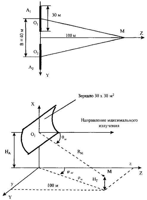 3. Функция Рис. П3.1 Пример 1. Антенна с квадратной апертурой Исходные данные и постановка задачи Техническое средство - оборудование ТРРСП ТР-120 на оконечной станции. Используются две несимметричных параболических антенны с размерами 30 × 30 м2. Разнос между антеннами 40 м, центры апертур антенн находятся на высоте НА = 25 м над землей, мощность, излучаемая одной антенной Р = 5 кВт (при кпд АФТ равном 1); длина волны λср = 0,3 м; КНД антенны D0,дБ = 47 дБ. Оценить ППМ в точке М, которая расположена в направлении на соседнюю станцию, а ее высота над землей - 2 м. Удаление точки М от линии проекции антенн на поверхность земли 100 м. Постановка задачи иллюстрируется рис. П3.2. Решение Расчет ППЭ выполняется сначала для одной антенны затем для другой. Результаты расчетов ППЭ суммируются. Расчет ППМ, создаваемой антенной A1 в точке М 1. Находится расстояние RM и угол θM: