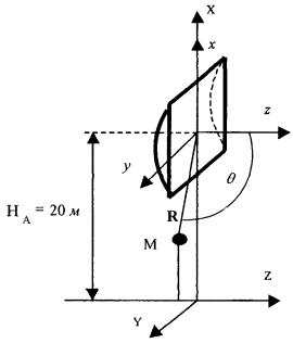 В терминах координат u, x направленные свойства апертуры характеризуются функцией F(u, x). Процесс расчета каждой функции F(u, x) требует значительных вычислительных затрат, которые быстро растут с увеличением отношения d/λ. Функции F(u, x) сильно осциллирующие, поэтому в практических расчетах ППЭ следует использовать их гарантированные огибающие. Для удобства практических расчетов гарантированные огибающие табулированы (приложение 1, таблицы 1.1 и 1.2). При значениях х > 1, что соответствует дальней зоне, необходимо пользоваться огибающими для x = 1. Значение КНД облучателя рассчитывается по формуле: Fобл (γ) = 0,316 для ψ0 < γ ≤ π · характеристика направленности облучателя, реализующая амплитудное распределение вида (2.2) и обеспечивающая уровень 0,316 вне сектора углов перехвата энергии зеркалом (ψ0 £ γ ≤ π). Термин «облучатель» следует понимать, как собственно облучатель в однозеркальной антенне, так и систему «облучатель - вспомогательное зеркало» в двухзеркальной антенне. График зависимости D = 10 lg Dобл, как функции аргумента ψ0 для усредненной модели антенн приведен на рис. П1.2 (приложение 1). Постановку задачи при расчете ППЭ в области I вблизи антенны с круглой апертурой иллюстрирует рис. 2.4, на котором центр апертуры - это О, а его высота над землей - НА. Угол α характеризует отклонение направления максимального излучения от плоскости горизонта. Ось Y системы координат XYZ совмещена с проекцией направления максимального излучения на плоскость XOY. Горизонтальная плоскость, на которой определяется ППЭ, находится на высоте НТ над землей. Расчетная точка задается либо через координаты ρM (расстояние до точки М вдоль поверхности земли) и φM, либо через у и х. Рис. 2.4. Постановка задачи. Заданными параметрами считаются: Р - мощность передатчика радиосредства, Вт; λ - длина волны, м; d - диаметр апертуры, м; D0 - КНД антенны в направлении максимального излучения в дальней зоне; 2ψ0 - угол раскрыва антенны (угол перехвата энергии облучателя зеркалом). В области I порядок расчета следующий: 1. Вычисляется расстояние от центра апертуры до расчетной точки М: