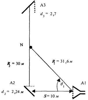 8. Подстановка исходных данных и найденного значения КНД в формулу (2.4) позволяет найти составляющую ППЭ от облучателя: Побл = 3 мкВт/см2. Суммарное значение ППЭ в точке М:П = 19,6 мкВт/см2. Пример 2 Исходные данные и постановка задачи Пирамидальный рупор, имеющий геометрические размеры (рис. 4.2) а = 28,5 см, b = 23,24 см, L = 90 см возбуждается волной Н10 на частоте f = 10000 МГц. Подводимая мощность Р = 100 Вт. Определить ППЭ в точке М с координатами R = 10 м, θ = 10°. Решение По формуле (4.4)...(4.6) находим: f(10°) = 1,236, max f(θ = 0) = 3,5762 По формулам (4.7)...(4.9) находим: f(10°) = 0,713, max f(θ = 0) = 2,779 По формуле (4.3) определяем F(θ,φ) = 0,08868 Значение КНД рупора определяем по формулам (4.10) и (4.11): Dp = 475. Искомое значение ППЭ находим по формуле (4.2): П = 0,2984 Вт/м2 = 29,84 мкВт/см2. Исходные данные и постановка задачи Конический рупор, имеющий геометрические размеры (рис. 4.3) r = 15 см, L = 45 см возбуждается на частоте f = 10000 МГц. Подводимая мощность Р = 100 Вт. Определить ППЭ в точке М с координатами R = 9 м, θ = 10°. Решение По формуле (4.13...4.19) находим: q1 = 0,7158 + 0,1115i, q2 = 5,8658 · 102 - 0,9488i, f(θ = 10°) = 0,6957, max f(θ) = 0,8622, F(θ) = 0,6511 Значение КНД рупора определяем по формул (4.20): Dp = 500. Искомое значение ППЭ находим по формуле (4.2): П = 31,9811 Вт/м2 = 3198,11 мкВт/см2 Приложение 5Примеры расчета ППЭ вблизи рупорно-параболической и перископической антеннПример 1. Рупорно-параболическая антенна Исходные данные и постановка задачи Конструкция антенны показана на рис. 5.1. Размеры апертуры 2,7 × 2,7 м. Мощность излучения 2 Вт, длина волны λ = 8,2 см, КНД антенны 39,5 дБ. Угол раскрыва рупора ψ0 = 35°. Определить значение ППЭ в точке M, лежащей на оптической оси антенны (ось Y) на расстоянии R = 18 м. Решение 1. Находятся значения обобщенных координат и, х: u = 0, x = 0,101. 2. По таблице П3.1 находится значения гарантированной огибающей: F(u, x) = 0. 3. Функции вида 10 lg(B(x) / x) находятся по графикам рис. П3.1: 10 lg(B(x) / x) = 13,0 дБ 4. Значение КНД облучателя находится по графику рис. П1.2: Do6л = 9,63 дБ 5. Подстановка исходных и найденных значений в формулу (3.2) позволяет найти апертурную составляющую ППЭ: Пa = 19,532 дБ, Па = 89,78 мкВт/см2 6. Подстановка исходных данных и найденного значения КНД в формулу (3.3) позволяет найти составляющую ППЭ от облучателя: Побл = -13,45 дБ, По6л = 0,0452 мкВт/см2. Суммарное значение ППЭ в точке М: П = 89,83 мкВт/см2. Пример 2. Перископическая антенна Исходные данные и постановка задачи Конструкция антенны показана на рис. 5.2. Диаметр нижнего зеркала А2 - 3,2 м, верхнего зеркала A3 - 3,9 м. Расстояние между верхним и нижним зеркалом 60 м, мощность излучения 2 Вт, длина волны λ = 3,7 см, КНД антенны 43 дБ. Диаметр раскрыва конического рупора r = 0,15 м, длина L = 0,5 м. Определить значение ППЭ в точке M, находящейся на оси мачты на высоте 30 м. Расстояние между рупором и мачтой 10 м. Постановка задачи иллюстрируется на рис. П5.1. Решение В точке N ППЭ имеет две составляющие - одну от нижней апертуры, другую от верхней. Вклад нижней апертуры (антенна А2) оценивается по формуле (3.21). Результаты расчета: х = 0,111, и = 0,20 lg(B(x) / x) = 14,6 дБ, F(u,x) = 0, Пa = 28,7 дБ = 749 мкВт/см2. Рис. П5.1. Вклад рупора (антенна А1) рассчитывается аналогично тому, как это сделано в примере 3 приложения 4. По формуле (4.13)...(4.19) находим: q1 = -0,374 + 0,0631i, q2 = 0,017 - 0,37i, q3 = 0,712 + 0,033i U1(θ = 71,6°) = 0,113, U2(θ = 71,6°) = -1,929 · 10-4, f(θ = 71,6°) = 0,072, тах f(θ = 8°) = 1,215, F(θ = 71,6°) = 0,059 Значение КНД рупора определяется по формуле (4.20): Dp = 328,7 Искомое значение вклада рупора в ППЭ находим по формуле (4.2): П = 1,955 Вт/м2, П = 195,5 мкВт/см2 Суммарное значение 