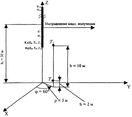 θM = arccos {[ρM · cos φ · cos α - (HA - HТ) sin α] / RM} Для α = 0, φ = arcctg (y/x) = arcctg (20/100) = 11,31°, ρM = (z2 + y2) = 102 м, θM = arсcos [(102 · cos 11,31°) / 104,5] = 16,95° 2. Находится граничное расстояние Rгр = 2d2 / λ = 2 · 302/0,3 = 6000 м 3. Определяются координаты х и и: х = RM / Rгр = 104,5 / 6000 = 0,01742, и = (πα sin θM) / λ = (π · 30 · sin 16,95°) / 0,3 = 91,59. Рис. П3.2. Иллюстрации к примеру расчета ППЭ от антенн ТРРСП. По графику рис. П3.1 определяется функция 20 lg [B(x) / x] = 13 дБ 5. По таблице П3.1 определяется функция 20 lg F(u, x) = -29,6 дБ 6. По формуле (3.2) рассчитывается