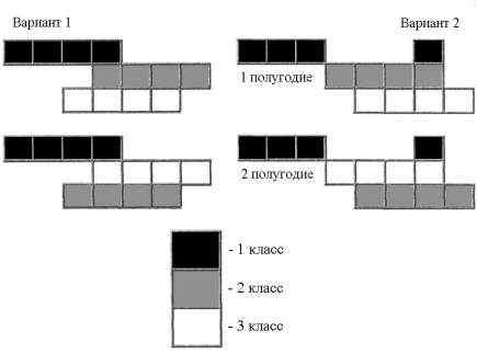 Во 2 варианте в первом классе после 3 урока проводится 2,5-часовой перерыв, во время которого организуется обед, сон, игры. В условиях полного совмещения проводятся уроки физкультуры, труда, пения, рисования.