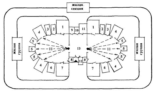 Помещения проживания. 5.37. Рекомендуемые состав и площади помещений проживания приведены в таблице 5.2. 5.38. Помещения проживания следует размещать в отдельных корпусе или блоке, непосредственно примыкающих к блокам других групп помещений или соединенным с ними теплым переходом. 5.39. Помещения проживания рекомендуется проектировать в виде изолированных секций, организованных по возрастному принципу, и состоящих из двух жилых групп на 9 воспитанников каждая. 5.40. Количество секций (на 18 воспитанников) определяется заданием на проектирование в зависимости от общего количества воспитанников ЗОШ. 5.41. В состав жилой секции входят: - две жилые группы; - комната дежурного воспитателя; - санитарный узел персонала; - бытовая комната; - комната уборочного инвентаря. 5.42. В состав жилой группы входят: - три спальные комнаты на 1 место; - две спальные комнаты на 3 места; - комната приготовления уроков; - комната тихого отдыха; - санитарный узел; - душевая; - комната хранения личных вещей воспитанников; - гардероб для хранения одежды воспитанников. 5.43. Входы в жилые группы и спальные комнаты проектируются с дверными проемами без дверного полотна для организации наблюдения за воспитанниками в ночное время. В проеме входа в жилую группу организуется пост режимной службы. 5.44. Вход в жилую секцию оборудуется запирающейся дверью. 5.45. Функционально-планировочная схема помещений жилой секции представлена на Рис. 2. 5.46. В состав оборудования спальных комнат входят кровати и стулья в соответствии с количеством мест в комнате. Гардеробная оборудуется шкафами-купе с секциями по количеству воспитанников в жилой группе. Комната хранения личных вещей воспитанников оборудуется стеллажами с закрывающимися ячейками. 5.47. Рекомендуемый состав оборудования санитарного узла: 2 унитаза, огороженных экранами высотой не более 1 м, и 2 умывальника. Рекомендуемый состав оборудования душевой: душ (2 душевые сетки), умывальник, скамья для раздевания, вешалка для одежды. В учреждении для мальчиков в состав оборудования санитарного узла следует включать 2 писсуара. В учреждении для девочек - бидэ. 5.48. Оборудование комнаты тихого отдыха должно быть приспособлено к проведению групповых психолого-коррекционных занятий. 5.49. Помещения для хранения чистого и грязного белья рекомендуется размещать поэтажно на 2-3 секции. 5.50. В блоке помещений проживать рекомендуется организовывать кабинеты дежурных медсестер, размещая их поэтажно на 2-3 секции. Рис. 2. Функционально-планировочная схема жилой секции 1. Комната приготовления уроков. 2. Санитарный узел. 3. Душевая. 4. Спальная комната на 3 места. 5. Спальная комната на 1 место. 6. Гардеробная. 7. Комната тихого отдыха. 8. Комната хранения личных вещей. 9. Комната уборочного инвентаря. 10. Санитарный узел персонала. 11. Комната дежурного воспитателя. 12. Бытовая комната. 13. Коммуникационное пространство. ● Пост режимной службы. Таблица 5.2. Рекомендуемые состав и площади помещений проживания.