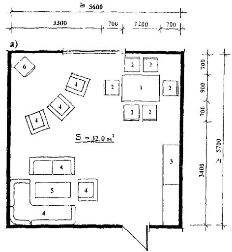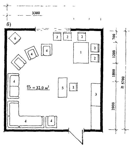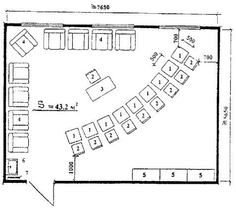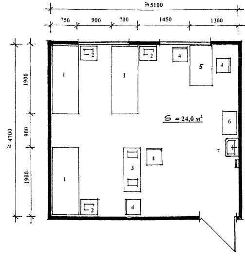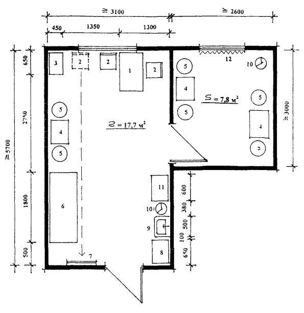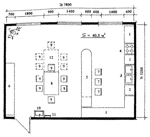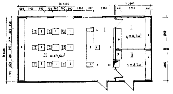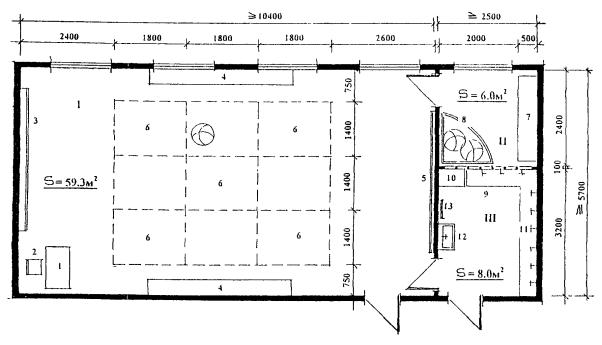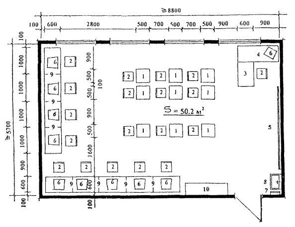 ЭКСПЛИКАЦИЯ ОБОРУДОВАНИЯ 1. Игровой стол 2. Стул 3. Комбинированный шкаф 4. Мягкая мебель 5. Журнальный стол 6. Телевизор Рис. П.2. Планировка и примеры расстановки оборудования комнаты тихого отдыха: а) для тихого отдыха, б) для проведения психолого-коррекционных занятий ЭКСПЛИКАЦИЯ ОБОРУДОВАНИЯ 1. Стол ученический 2. Стул 3. Стол учителя 4. Классная доска 5. Умывальник 6. Вешалка для полотенца Рис. П.3. Класс ЭКСПЛИКАЦИЯ ОБОРУДОВАНИЯ I. КАБИНЕТ 1. Стол ученический - лабораторный 2. Стул ученический 3. Стол демонстрационный 4. Стул учительский 5. Мойка (умывальник) 6. Бак для мусора 7. Классная доска 8. Комбинированный шкаф II, III. ЛАБОРАНТСКИЕ 9. Шкаф-стеллаж 10. Вытяжной шкаф Рис. П.4. Кабинет для занятий физикой и химией (I) с лаборантскими (II) и (III) ЭКСПЛИКАЦИЯ ОБОРУДОВАНИЯ 1. Стол 2. Стул 3. Стол специалиста 4. Компьютерный стол специалиста 5. Классная доска 6. Компьютер 7. Вешалка для полотенца 8. Умывальник 9. Ученический компьютерный стол 10. Комбинированный шкаф Рис. П.5. Компьютерный класс ЭКСПЛИКАЦИЯ ОБОРУДОВАНИЯ 1. Стол - шкаф кухонный 2. Холодильник 3. Мойка 4. Плита 5. Сервировочная стойка с разделочным столом 6. Комбинированная стенка 7. Табурет 8. Обеденный стол 9. Стул 10. Умывальник 11. Вешалка для полотенца 12. Стол резервный Рис. П.6. Мастерская кулинарного творчества ЭКСПЛИКАЦИЯ ОБОРУДОВАНИЯ I. МАСТЕРСКАЯ 1. Стол ученический для индивидуальной работы 2. Стул 3. Рабочий стол 4. Швейная машина 5. Табурет регулируемый 6. Мольберт 7. Стол мастера 8. Стул мастера 9. Умывальник 10. Вешалка для полотенца 11. Шкаф для экспозиций II. КЛАДОВАЯ 12. Комбинированный шкаф Рис. П.7. Театрально-художественная мастерская с кладовой ЭКСПЛИКАЦИЯ ОБОРУДОВАНИЯ I. КОМНАТА 1. Стул 2. Пюпитр 3. Помост для преподавателя 4. Пианино 5. Табурет винтовой 6. Стол преподавателя II. КЛАДОВАЯ 7. Комбинированный шкаф Рис. П.8. Комната музыкальных занятий с кладовой инструментов ЭКСПЛИКАЦИЯ ОБОРУДОВАНИЯ I. ИЗОСТУДИЯ 1. Мольберт 2. Помост для моделей 3. Стенд для рисунков и картин 4. Стол преподавателя 5. Стул преподавателя 6. Умывальник 7. Вешалка для полотенца II. КЛАДОВАЯ 8. Комбинированный шкаф Рис. П.9. Изостудия с кладовой