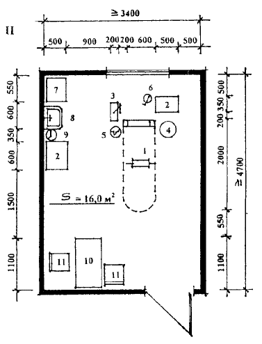 ЭКСПЛИКАЦИЯ ОБОРУДОВАНИЯ I. КАБИНЕТ ВЕНЕРОЛОГА-ГИНЕКОЛОГА 1. Кресло гинекологическое 2. Винтовой табурет 3. Передвижной светильник 4. Стол врача 5. Стул 6. Столик инструментальный 7. Бачок для мусора 8. Умывальник 9. Шкаф медицинский 10. Ширма II. КАБИНЕТ СТОМАТОЛОГА 1. Кресло стоматологическое 2. Столик инструментальный 3. Установка стоматологическая, универсальная 4. Винтовой табурет 5. Плевательница 6. Светильник 7. Шкаф медицинский 8. Умывальник 9. Бачок для мусора 10. Стол врача 11. Стул Рис. П.10. Кабинеты венеролога-гинеколога (I) и стоматолога (II) ЭКСПЛИКАЦИЯ ОБОРУДОВАНИЯ 1. Стол врача 2. Стул 3. Столик с набором линз для проверки остроты зрения 4. Офтальмологические установки 5. Табурет винтовой 6. Кушетка смотровая 7. Таблица 8. Шкаф медицинский 9. Умывальник 10. Бачок для мусора 11. Столик инструментальный 12. Светозащитная штора Рис. П.11. Кабинет офтальмолога с темной комнатой ЭКСПЛИКАЦИЯ ОБОРУДОВАНИЯ 1. Стационарная ингаляционная установка 2. Винтовой табурет 3. Стол процедурной медсестры 4. Стул 5. Умывальник 6. Бачок для мусора Рис. П.12. Ингаляторий на 3 места ЭКСПЛИКАЦИЯ ОБОРУДОВАНИЯ 1. Кушетка 2. Столик с аппаратурой 3. Столик с аппаратурой для приема процедур сидя 4. Стул 5. Стол врача 6. Шкаф медицинский 7. Умывальник Рис. П.13. Кабинет физиотерапии ЭКСПЛИКАЦИЯ ОБОРУДОВАНИЯ I. ЗАЛ 1. Стол методиста 2. Стул методиста 3. Шведская стенка 4. Скамья 5. Зеркало 6. Маты для занятий II. КЛАДОВАЯ 7. Комбинированный шкаф 8. Манеж для складирования мячей III. РАЗДЕВАЛКА 9. Скамья для переодевания 10. Шкаф методиста 11. Крючки для одежды 12. Умывальник 13. Вешалка для полотенца Рис. П.14. Кабинет групповых занятий ЛФК с кладовой и раздевалкой ЭКСПЛИКАЦИЯ ОБОРУДОВАНИЯ 1. Стол 2. Стул 3. Стол специалиста 4. Кресло 5. Шкаф - стеллаж 6. Умывальник 7. Вешалка для полотенца Рис. П.15. Кабинет групповой психотерапии на 9 человек ЭКСПЛИКАЦИЯ ОБОРУДОВАНИЯ I. ПОМЕЩЕНИЕ ПОСТА РЕЖИМНОЙ СЛУЖБЫ а) Комната дежурного 1. Стол с пультом управления 2. Стул 3. Стеллаж для складирования передач б) Санузел II. ПРОХОД ДЛЯ СОТРУДНИКОВ И ПОСЕТИТЕЛЕЙ НА ТЕРРИТОРИЮ ЗОШ 4. Турникет III. ВОРОТА ДЛЯ ПРОЕЗДА АВТОТРАНСПОРТА НА ТЕРРИТОРИЮ ЗОШ Рис. П.16. Помещение контрольно-пропускного пункта |