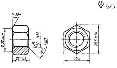 2 То же, класса точности С, исполнения 2, из автоматной стали без цинкового покрытия: Гайка С2 М22 - 7Н.5.А ГОСТ 16018-79. (Измененная редакция, Изм. № 1, 2). 1.2. Допускается изготовление гаек в исполнении 1, высотой 18 и 20 мм по согласованию потребителя с изготовителем. 1.3. Вариант изготовления торца гайки в исполнении 2 устанавливает предприятие-изготовитель. 2. ТЕХНИЧЕСКИЕ ТРЕБОВАНИЯ2.1. Гайка должна изготовляться в соответствии с требованиями настоящего стандарта и ГОСТ 1759.0-87 по рабочим чертежам, утвержденным в установленном порядке. 2.2. Механические свойства гаек должны соответствовать классу прочности 5 или 6 по ГОСТ 1759.5-87. 2.1, 2.2. (Измененная редакция, Изм. № 2). 2.3. Гайки должны иметь то же покрытие, что и комплектуемые ими болты. Толщина покрытия 9 - 15 мкм. Требования к покрытию - по ГОСТ 9.301-86. По согласованию изготовителя с потребителем гайки могут изготовляться без покрытия. 2.4. Резьба - по ГОСТ 24705-81. После допуска - 7Н по ГОСТ 16093-81. (Измененная редакция, Изм. № 2). 2.5. Смещение оси отверстия гайки относительно оси симметрии не должно быть более 0,9 мм. 2.6. В гайках в исполнении 2 допускается утяжка металла, приводящая к местному уменьшению высоты ребер не более 3 мм. 2.7. Масса 1000 гаек (справочная): 114 кг - в исполнении 1; 126 кг » » 2. Примечания: 1. Когда возможно применение гаек как в исполнении 1, так и в исполнении 2, в конструкторской документации должна указываться масса гаек в исполнении 1. 2. Изменение массы 1000 гаек при изменении их высоты на 1 мм не должно быть более 6,5 кг. 2.8. Правила приемки - по ГОСТ 17769-83. 2.9. Методы контроля гаек - по ГОСТ 1759.0-87. Испытания механических свойств гаек должны проводиться по требованию потребителя по ГОСТ 1759.5-87. Допуски размеров, формы и расположение поверхностей и методы контроля - по ГОСТ 1759.1-82. Дефекты поверхности - по ГОСТ 1759.2-82. (Измененная редакция, Изм. № 1, 2). 2.10. Контроль качества цинкового покрытия - по ГОСТ 9.302-88. 2.11. (Исключен, Изм. № 1). 2.12. Гайки должны быть отгружены в комплекте с болтами для рельсовых скреплений. Допускается транспортирование гаек как отдельных изделий. В этом случае упаковка гаек и маркировка тары - по ГОСТ 18160-72. ПРИЛОЖЕНИЕ