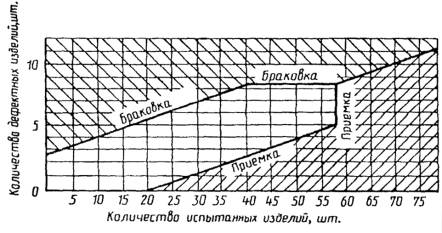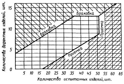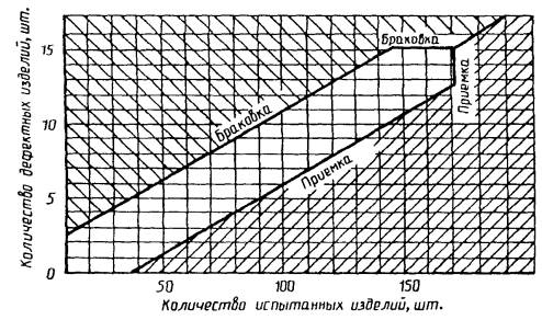 Контрольная проверка завершается, когда репрезентативная точка, отражающая протекание испытаний, попадает на диаграмме в зону приемки или в зону браковки.