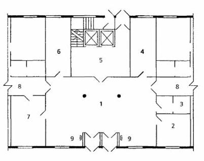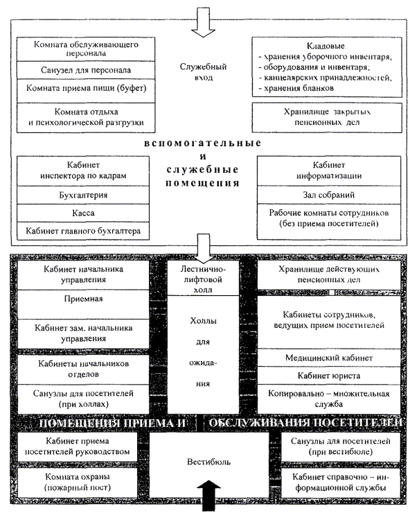 обозначения: Рис. 2.1. Схема взаимосвязи помещений ОУСЗН Условные обозначения: Рис. 2.2. Схема взаимосвязи помещений МУСЗН 3. Функциональное зонирование зданий управлений.3.1. Окружные управления социальной защиты населения.3.1.1. Функциональное зонирование зданий ОУСЗН (рис. 2.1.) предусматривает две основные функциональные зоны: - зона помещений приема и обслуживания посетителей; - зона служебных и вспомогательных помещений. 3.1.2. К зоне приема и обслуживания посетителей относятся: - помещения входной группы (вестибюль, комната охраны - пожарный пост, кабинет приема посетителей руководством управления, санузел для посетителей) (см. рис. 3.1.); - лестнично-лифтовой холл; - холл для ожидания перед кабинетами сотрудников, ведущих прием посетителей; - кабинеты сотрудников, ведущих прием посетителей, кабинет юриста; - кабинеты администрации (приемная, кабинет начальника управления, кабинет зам. начальника); Функциональные связи помещении этой зоны должны быть короткими и простыми, обеспечивая удобные пути эвакуации посетителей и сотрудников из здания, а также оснащаться системой визуальной информации и ориентиров. 3.1.3. В вестибюле предусматриваются зоны для установки телефонов автоматов и киосков (аптечного, периодической печати), а также санузел для посетителей. Перед кабинетом приема посетителей руководством управления должна быть предусмотрена зона для ожидания, оборудованная соответствующей мебелью. Из кабинета приема посетителей предусматривается второй выход в коридор управления. 3.1.4. Вестибюль должен иметь удобную планировочную связь с холлами для ожидания перед кабинетами сотрудников, ведущих прием посетителей и лестнично-лифтовым холлом. 3.1.5. Кабинеты администрации могут располагаться на втором или третьем этаже, так как основной прием посетителей руководством предусматривается в специальном кабинете при вестибюле. 3.1.6. Кабинеты инспекторов, ведущих прием населения, проектируются на одно или два рабочих места. 3.1.7. Зона служебных и вспомогательных помещений включает: - рабочие комнаты сотрудников (без приема посетителей); - кабинеты главных специалистов и начальников отделов; - зал собраний (с подсобным помещением); - отдел информатизации; - кабинет инспектора по кадрам; - кабинет главного бухгалтера, бухгалтерию, кассу; - копировально-множительную службу; - комнату отдыха и психологической разгрузки; - комнату приема пищи (или буфет с подсобным помещением, столовую); - комнату обслуживающего персонала; - кладовые (хранения бланков, канцпринадлежностей и расходных материалов, оборудования и инвентаря, хранения уборочного инвентаря); - санузлы для персонала. Следует предусматривать изоляцию зоны этих помещений. Доступ для посетителей в нее должен быть закрыт. Рекомендуется предусматривать отдельный служебный вход. 3.1.8. Рабочие комнаты сотрудников проектируются, как правило, на 2 - 4 рабочих места, а кабинеты главных специалистов и начальников отделов - на 1 - 2 рабочих места. 3.1.9. Зал собраний предназначен для проведения совещаний с сотрудниками окружного и муниципальных управлений, работы с представителями учреждений и организаций. Для увеличения вместимости зала рекомендуется предусматривать варианты трансформации смежных пространств - холлов, залов, а также подсобного помещения (при зале) для хранения дополнительной пер