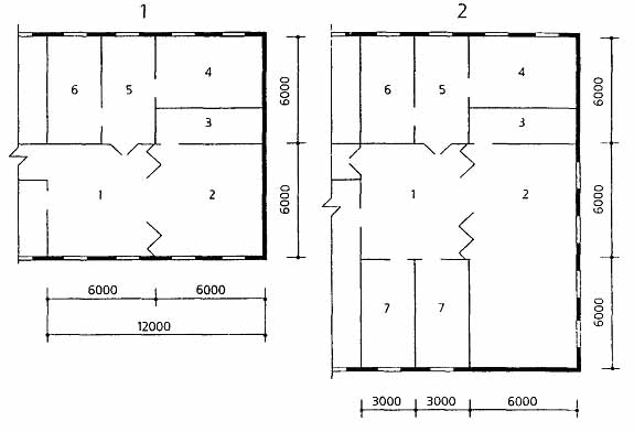 Рис. 4.13. Рабочие комнаты сотрудников на два рабочих места (без приема посетителей). Варианты 1, 2, 3. Экспликация