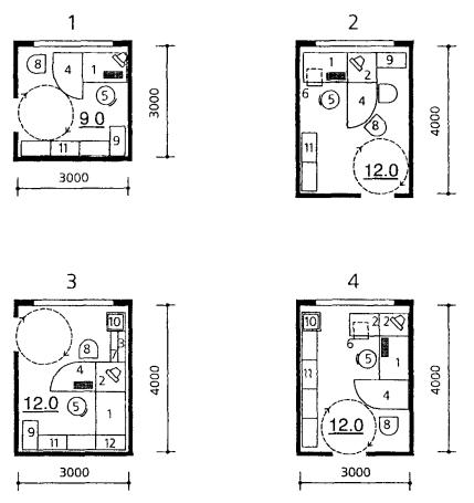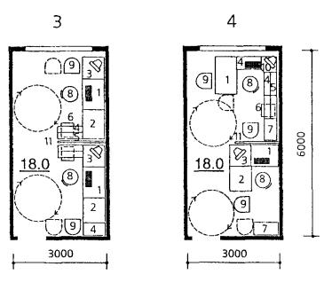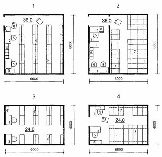 Рис. 4.11. Медицинский кабинет. Варианты 1, 2. Экспликация 1. Стол 2. Стол для обслуживания посетителей 3. Тумба для оргтехники 4. Каталожные шкафы 5. Стул рабочий подъемно-поворотный 6. Стеллажи стационарные открытые 7. Стеллажи передвижные 8. Тележка для транспортировки документов Рис. 4.12. Помещения хранилищ с хранением документов на открытых (варианты 1, 3) и передвижных стеллажах (варианты 2, 4). Экспликация