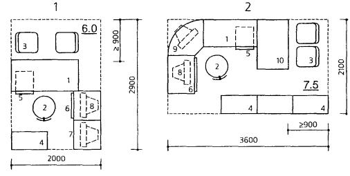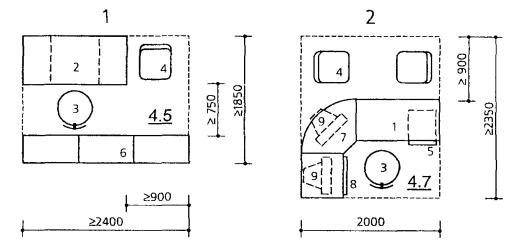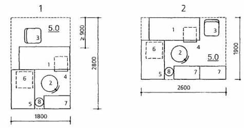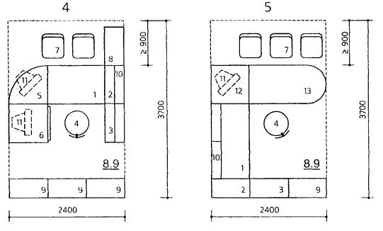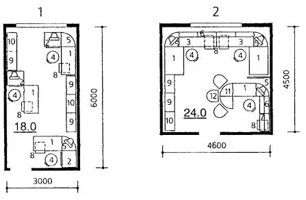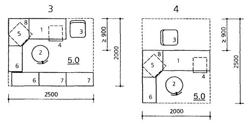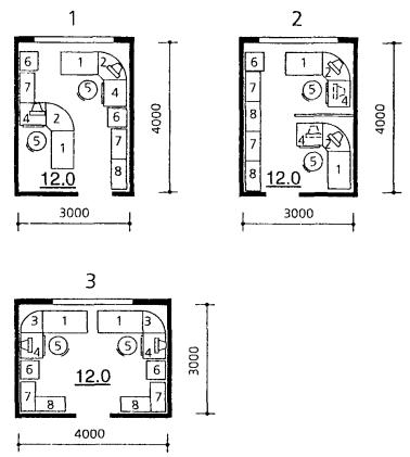 Рис. 4.17. Рабочее место начальника управления. Варианты 1, 2. Экспликация 1. Стол 2. Кресло рабочее подъемно-поворотное 3. Кресло для посетителей 4. Мобильная тумба 5. Боковой стол 6. Место для компьютера (или пишущей машинки) 7. Стеллаж (шкаф для документов) 8. Корзина для мусора Рис. 4.18. Рабочее место секретаря. Варианты 1, 2. Экспликация. 1. Стол рабочий 2. Кресло подъемно-поворотное 3. Кресло для посетителей 4. Мобильная тумба 5. Место для компьютера (или пишущей машинки) 6. Боковая тумба 7. Стеллаж (шкаф для документов) 8. Стол-приставка угловой для компьютера Рис. 4.19. Рабочее место секретаря. Варианты 3, 4. Экспликация.