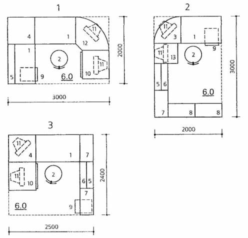 Рис. 4.26. Рабочее место сотрудника (без приема посетителей). Варианты 1, 2, 3. Экспликация.