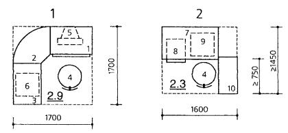 Рис. 4.27. Рабочее место оператора текстового компьютера и машинистки. Варианты 1, 2. Экспликация 1 Стол рабочий 2 Тумба боковая 3 Кресло рабочее подъемно-поворотное 4 Ксерокопировальный аппарат 5 Шкаф для документов Рис. 4.28. Рабочее место оператора настольного ксерокопировального аппарата. Варианты 1, 2. Приложение 1Схема генерального плана участка управления социальной защиты населения. (Встроенно-пристроенный вариант).
