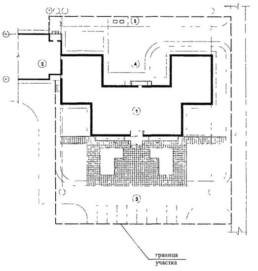 Экспликация 1 Здание управления 2 Жилой дом 3 Стоянка на 10 автомашин (для посетителей) 4 Стоянка для служебных автомашин 5 Площадка для мусоросборников Приложение 2Пример планировочного решения муниципального управления социальной защиты населения на 50 сотрудников.План I этажа.