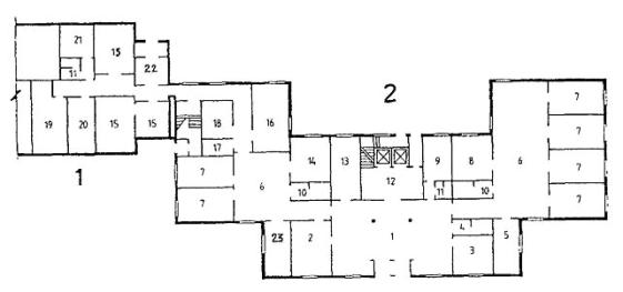 Условные обозначения: 1. Встраиваемая часть здания. 2. Пристраиваемая часть здания. Экспликация помещений 1. Вестибюль. 2. Кабинет приема посетителей руководством управления. 3. Кабинет справочно-информационной службы. 4. Санузел для посетителей (при вестибюле). 5 Кабинет начальника отдела. 6. Холл для ожидания. 7. Кабинет сотрудников, ведущих прием посетителей. 8. Медицинский кабинет. 9. Кабинет информатизации. 10. Санузлы для посетителей. 11. Санузлы для сотрудников. 12. Лестнично-лифтовой холл. 13. Комната охраны - пожарный пост. 14. Кабинет юриста. 15. Рабочие комнаты сотрудников (без приема посетителей). 16. Хранилище действующих пенсионных дел. 17. Кладовая уборочного инвентаря. 18. Кладовая хранения бланков. 19. Комната приема пищи. 20. Комната отдыха и психологической разгрузки. 21. Комната обслуживающего персонала. 22. Служебный вход. 23. Копировально-множительная служба. План II этажа.