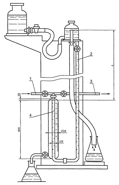 4.2 ГерметичностьГерметичность проверяют одним из двух методов: - объемным методом с использованием устройства, схема которого приведена на рисунке 1, - для испытательного давления до 15 кПа включительно; Рисунок 1 - Устройство для проверки герметичности газового тракта объемным методом L -