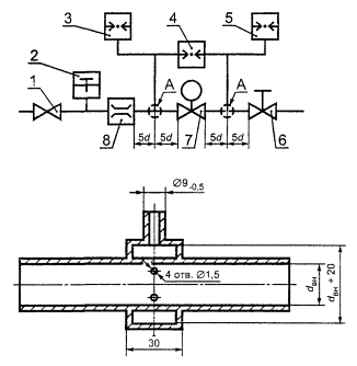 где Vg - суммарный внутренний объем испытываемого устройства контроля пламени и испытательного стенда, см3; Р' - абсолютное давление воздуха в начале испытания, кПа; Р" - абсолютное давление воздуха в конце испытания, кПа. Падение давления измеряют в течение 5 мин. 4.2.2 Герметичность газового тракта Перед испытанием съемные детали клапана, которые могут быть демонтированы во время текущего обслуживания, пятикратно демонтируют и вновь монтируют в соответствии с инструкцией изготовителя. Для проверки герметичности газового тракта проводят следующие испытания: а) при открытом положении клапана (клапанов) устройства контроля пламени (для открытия клапана применяют любой источник постоянного тока) на входное соединение подают воздух под давлением по 4.2.1, при этом выходное соединение устройства контроля пламени герметизируют; б) проводят испытание в соответствии с перечислением а) настоящего пункта при закрытом клапане (клапанах); в) проводят испытание в соответствии с перечислением а) настоящего пункта при положении розжига (кнопку розжига удерживают в нажатом состоянии); г) если корпус имеет неметаллические детали, отделяющие газосодержащие полости от атмосферы, такие детали удаляют и повторяют испытания по перечислениям а) и б) настоящего пункта испытательным давлением, равным максимальному рабочему давлению. Утечка воздуха не должна превышать 30 дм3/ч. Тороидальные резиновые кольца, прокладки и уплотнительные материалы во время этого испытания не удаляют. 4.2.3.1 Герметичность клапана в закрытом положении Клапан устройства контроля пламени, соединенного с прибором для измерения герметичности, должен находиться в закрытом положении. На входное соединение устройства контроля пламени подают воздух под давлением, указанным в 4.2.1. Измеряют значение утечки и приводят ее к стандартным условиям (4.1.1). Если устройство контроля пламени имеет более одного клапана, испытание повторяют с каждым клапаном, находящимся в закрытом положении, другие клапаны должны быть полностью открыты. 4.2.3.2 Герметичность клапана в положении розжига Для двухпроводных устройств контроля пламени с каналом запальной горелки этот канал блокируют и на входное соединение устройства подают воздух под давлением, указанным в 4.2.1. 4.2.3.3 Герметичность клапана в закрытом положении при максимальной и минимальной температурах окружающей среды Проводят испытание по 4.2.3.1 с устройством контроля пламени при максимальной и минимальной температурах окружающей среды по 3.1.2. Герметичность клапана проверяют после установления теплового равновесия. 4.3 Номинальный расход газа4.3.1 Испытательный стенд Испытание проводят на стенде, схема которого приведена на рисунке 3, при значениях dвн, указанных в таблице 6. Точность измерения номинального расхода газа должна быть не менее ± 2 %. Рисунок 3 - Стенд для измерения расхода газа А - деталь; dвн - внутренний диаметр