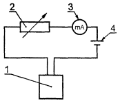 где q - измеренный расход воздуха, м3/ч; Ра - атмосферное давление, Па; Р - испытательное давление, Па; t - температура воздуха, °С. 4.4 Крутящий момент и усилие нажатия ручки управления4.4.1 Крутящий момент Крутящий момент ручки управления измеряют динамометрическим ключом с точностью измерения в пределах ± 10 % измеренного значения крутящего момента по таблице 3. Проверяют соответствие требованиям 3.4.1. Открывающие и закрывающие движения ручки управления выполняют с постоянной угловой скоростью 1,5 рад/с. 4.4.2 Усилие нажатия ручки управления Усилие нажатия ручки управления измеряют динамометром с точностью измерения в пределах ± 10 % измеренного значения. Проверяют выполнение требований 3.4.2. 4.5 БлокировкиПроверяют соответствие требованиям 3.5. Каждое испытание повторяют пять раз. 4.5.1 Блокировка розжига Проверяют возможность розжига запальной горелки только при открытом проходе газа к запальной и закрытом проходе газа к основной горелкам. При открытом проходе газа к основной горелке розжиг запальной горелки должен быть невозможен. 4.5.2 Блокировка повторного розжига Нажимают кнопку устройства контроля пламени и удерживают ее в нажатом положении. Клапан устройства контроля пламени открывают с помощью любого источника постоянного тока. В этом состоянии устройства контроля пламени попытка повторного розжига запальной горелки (или основной горелки) не допускается. 4.6 Определение силы тока размыкания магнитной пробки4.6.1 Общие положения Устройство контроля пламени подключают к моделирующему термопару источнику постоянного тока напряжением 2 В (см. рисунок 4). Колебание напряжения постоянного тока не должно превышать ± 2 %. Реостат должен обеспечивать возможность регулирования силы тока от 30 до 1500 мА. Для измерения силы тока используют миллиамперметр с ценой деления 1,0 мА в интервале от 50 до 300 мА. Рисунок 4 - Электрическая схема для измерения силы тока размыкания магнитной пробки устройства контроля пламени 1 - испытуемый образец устройства контроля пламени; 2 - реостат; 3 - миллиамперметр; 4 - источник постоянного тока 4.6.2 Проведение испытания Испытание по определению силы тока размыкания магнитной пробки проводят в следующей последовательности: а) устройство контроля пламени переводят в положение розжига, когда клапан устройства контроля пламени удерживают открытым нажатием кнопки или поворотом ручки управления (магнитная пробка при этом прижата к электромагниту); б) на электромагнит подают ток, постепенно повышая силу тока со скоростью не более 30 мА/с, пока его значение не превысит в три раза максимальную ЭДС, указанную изготовителем; в) отпускают кнопку управления, клапан устройства контроля пламени должен оставаться полностью открытым (магнитная пробка удерживается электромагнитом); г) силу тока увеличивают до 1500 мА и выдерживают 60 с; д) силу тока постепенно уменьшают до 300 % максимальной ЭДС, указанной изготовителем; е) силу тока постепенно, со скоростью не более 10 мА/с, уменьшают до момента закрытия клапана устройства контроля пламени, то есть до момента размыкания магнитной пробки и электромагнита; ж) измеряют силу тока в момент закрытия клапана. Испытание повторяют 10 раз. За окончательный результат принимают среднеарифметическое значение 10 последовательно выполненных измерений. 4.7 Кручение и изгиб4.7.1 Общие положения Испытани