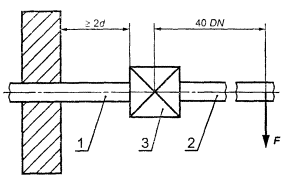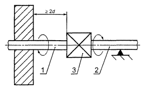д) перед проведением испытаний на кручение и изгиб устройство контроля пламени подвергают испытанию на герметичность по 4.2.2, перечисление а) и 4.2.3.1. 4.7.2 Испытание на кручение для устройств контроля пламени групп 1 и 2 Испытание проводят в следующей последовательности: а) к трубе 1 (рисунок 5) на расстоянии, равном или большем 2d от устройства, прикладывают крутящий момент в соответствии с таблицей 4 для времени испытания 10 с; б) к трубе 2 прикладывают крутящий момент в соответствии с таблицей 4 для времени испытания 10 с. Крутящий момент прикладывают так, чтобы в устройстве контроля пламени не возникало изгибающих моментов. Крутящий момент прикладывают, увеличивая его постепенно и плавно. Последние 10 % значения крутящего момента прикладывают в течение не более 1 мин. Превышение значений крутящего момента, указанных в таблице 4, не допускается; в) после снятия нагрузки визуально проверяют отсутствие деформаций, а также герметичность газового тракта по 4.2.2, перечисление а) и герметичность клапана по 4.2.3.1. Если входной и выходной патрубки устройства контроля пламени смещены относительно общей оси, присоединения меняют местами и испытание повторяют. Рисунок 5 - Схема испытания устройства контроля пламени на кручение d -