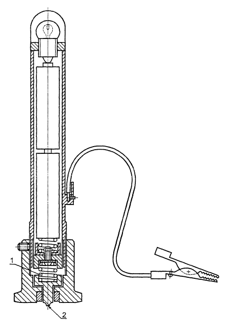 где m1 - масса деталей до погружения в пентан, г; m2 - масса деталей, извлеченных из сушильного шкафа, г. 4.8.2 Усталость (термостойкость и цикличность) Устройство контроля пламени в закрытом положении подвергают испытаниям на термостойкость, выдерживая его: а) 48 ч при температуре 0 °С или при минимальной рабочей температуре, указанной изготовителем (если она ниже); б) 48 ч при температуре 60 °С или при максимальной рабочей температуре, указанной изготовителем (если она выше). После испытаний при температуре окружающей среды проверяют выполнение требований по 3.8.2. Устройство контроля пламени устанавливают согласно инструкции по эксплуатации изготовителя в термокамеру с устройством регулирования температуры. На входное соединение устройства контроля пламени подают воздух с номинальным расходом и под максимальным рабочим давлением. Прикладываемые к устройству контроля пламени крутящий момент или усилие нажатия ручки управления в течение испытания на цикличность должны составлять от 130 % до 150 % крутящего момента или усилия нажатия ручки управления, указанных в инструкции изготовителя. Если устройство контроля пламени управляется кнопкой, то в течение всего времени испытания прикладываемое усилие нажатия ручки управления должно быть постоянным и направлено вдоль оси движения кнопки со скоростью 100 мм/с. Если устройство контроля пламени управляется поворотной ручкой, то число рабочих циклов в минуту не должно превышать 20. Сила тока, подаваемого на устройство контроля пламени во время испытания, должна в три раза превышать максимальную ЭДС, указанную изготовителем. Каждый рабочий цикл выполняют так, чтобы ток не был подан до смыкания магнитной пробки клапана с электромагнитом. В зависимости от класса клапана и температуры окружающей среды проводят следующее число циклов: а) класс А: 10000 - при максимальной температуре окружающей среды с допуском минус 5 °С; 25000 - при температуре окружающей среды (20 ± 5) °С; 5000 - при минимальной температуре окружающей среды с допуском плюс 5 °С; б) класс В: 2000 - при максимальной температуре окружающей среды с допуском минус 5 °С; 7000 - при температуре окружающей среды (20 ± 5) °С; 1000 - при минимальной температуре окружающей среды с допуском плюс 5 °С; в) класс С: 1000 - при максимальной температуре окружающей среды с допуском минус 5 °С; 3000 - при температуре окружающей среды (20 ± 5) °С; 1000 - при минимальной температуре окружающей среды с допуском плюс 5 °С. Работоспособность и правильное функционирование устройства контроля пламени во время испытания на цикличность контролируют постоянно, например измерением давления на его выходе или расхода газа. 4.8.3 Определение прочности лакокрасочного покрытия Механическую прочность лакокрасочного покрытия определяют приспособлением, схема которого приведена на рисунке 7. Жестко закрепленным стальным шариком (рабочей точкой) диаметром 1 мм проводят вдоль испытуемой поверхности устройства контроля пламени со скоростью от 30 до 40 мм/с и силой контакта 10 Н. Испытание выполняют дважды до и после испытания на влагостойкость по 4.8.4. Рисунок 7 - Приспособление для проверки механической прочности лакокрасочного покрытия 1 - пружина; 2 - рабочая точка (стальной шарик диаметром 1 мм) 4.8.4 Испытание на влагостойкость Устройство контроля пламени помещают на 48 ч в камеру при температуре 40 °С и
